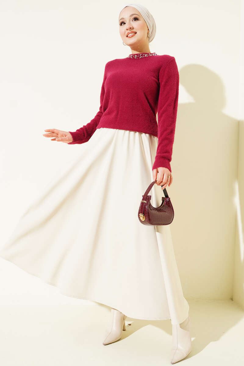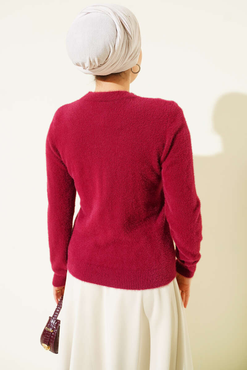 Bisiklet Yaka Sakal Detaylı Kazak Bordo