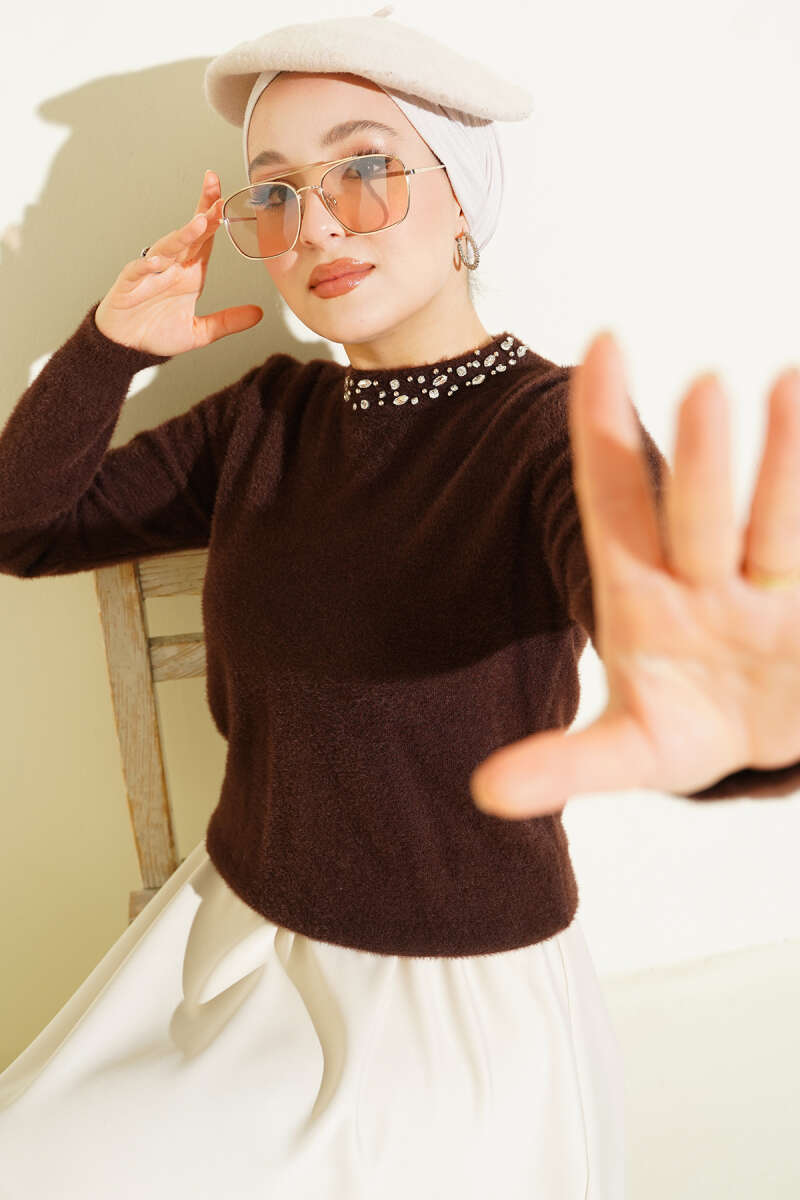 Bisiklet Yaka Sakal Detaylı Kazak Latte