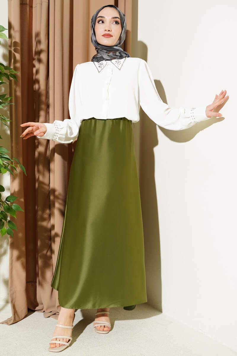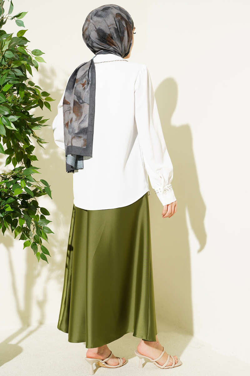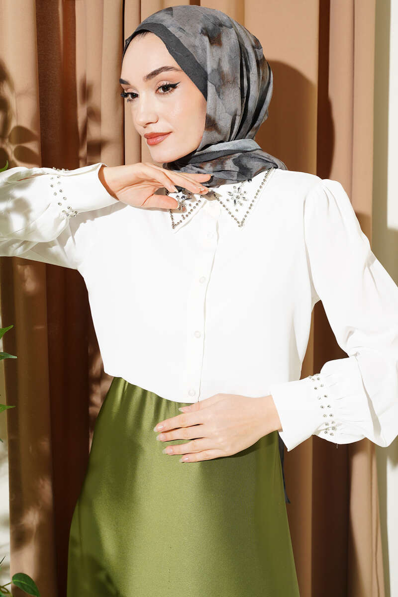 Yakası Ve Kol Manşeti Taşlı Gömlek Ekru