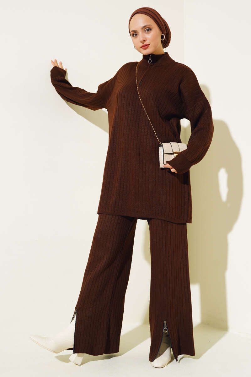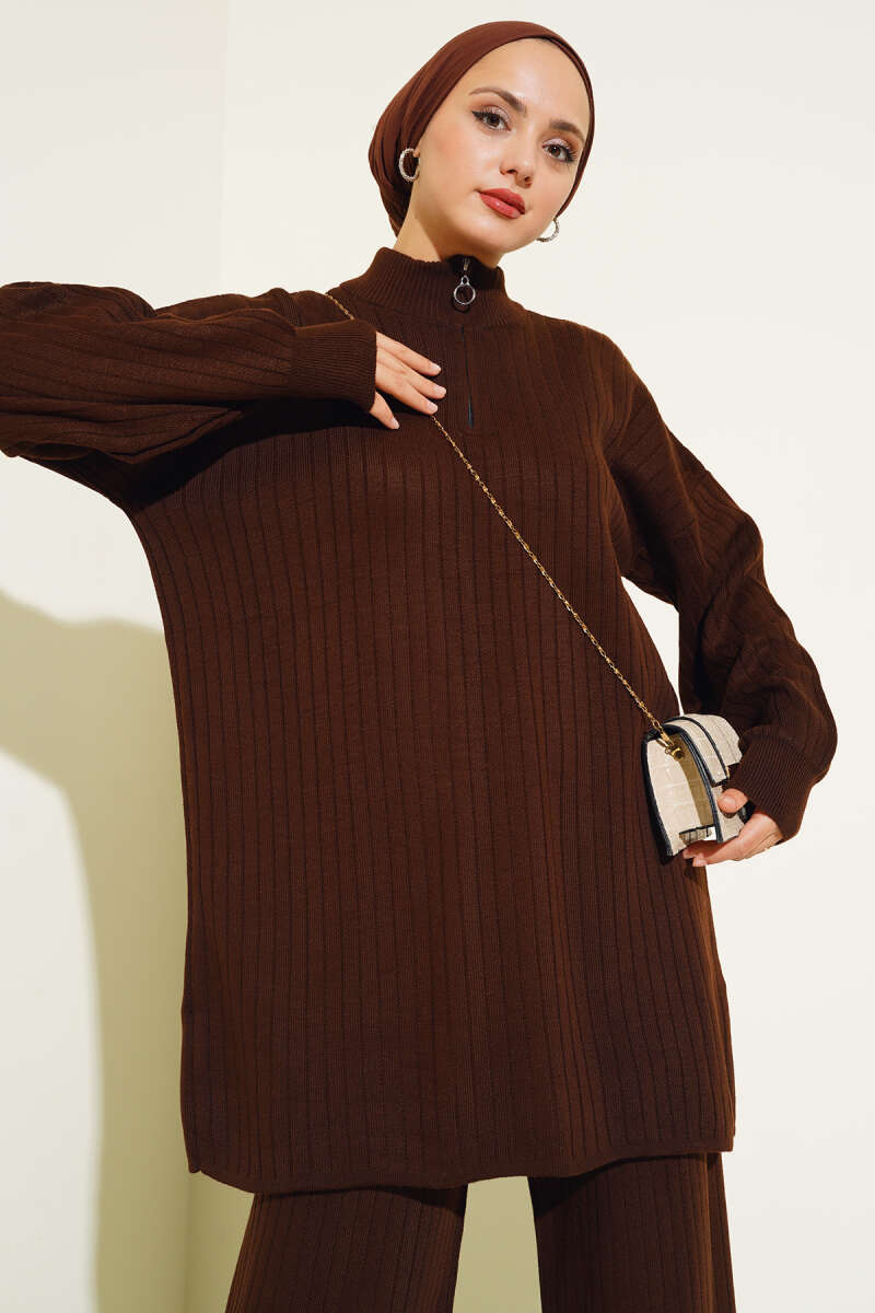 Balon Kol Balıkçı Yaka Triko İkili Takım Kahve