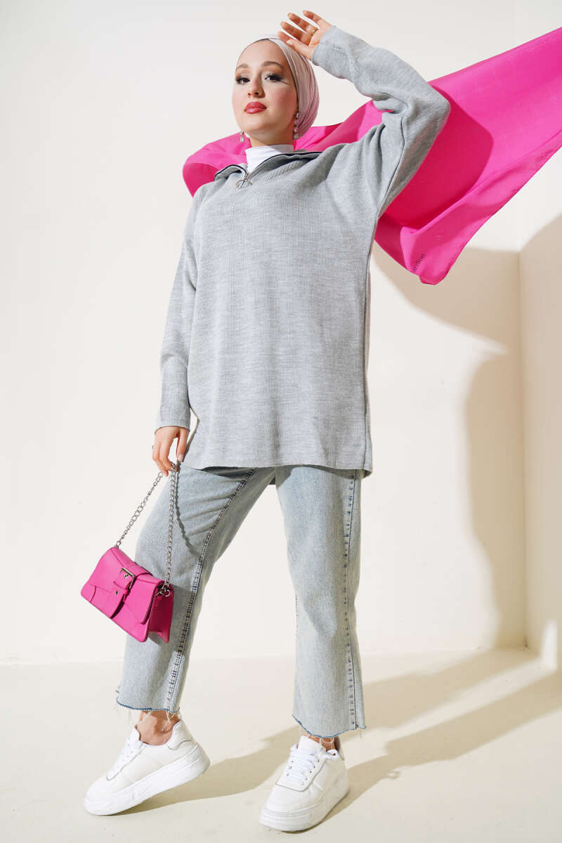 Yakası Yarım Fermuarlı Triko Tunik Kırmızı