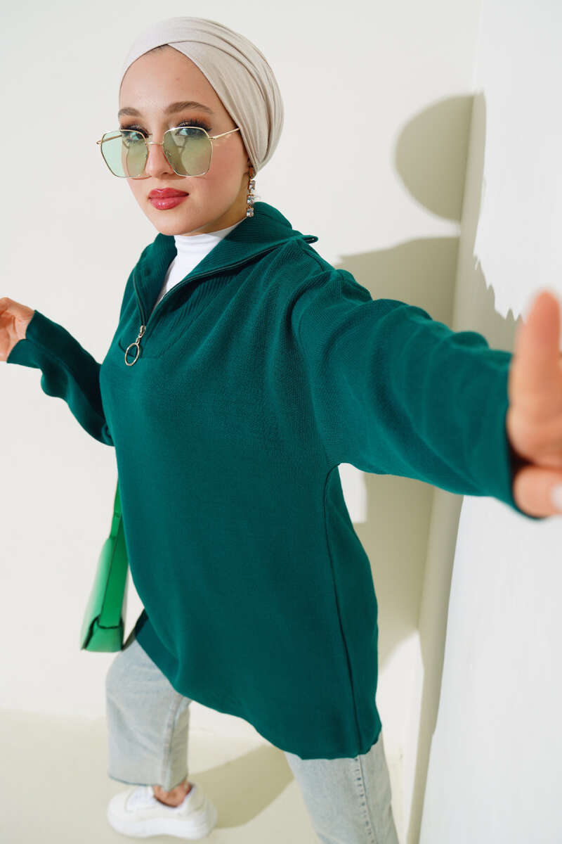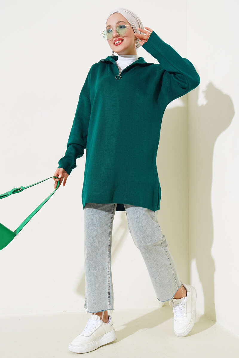 Yakası Yarım Fermuarlı Triko Tunik Siyah