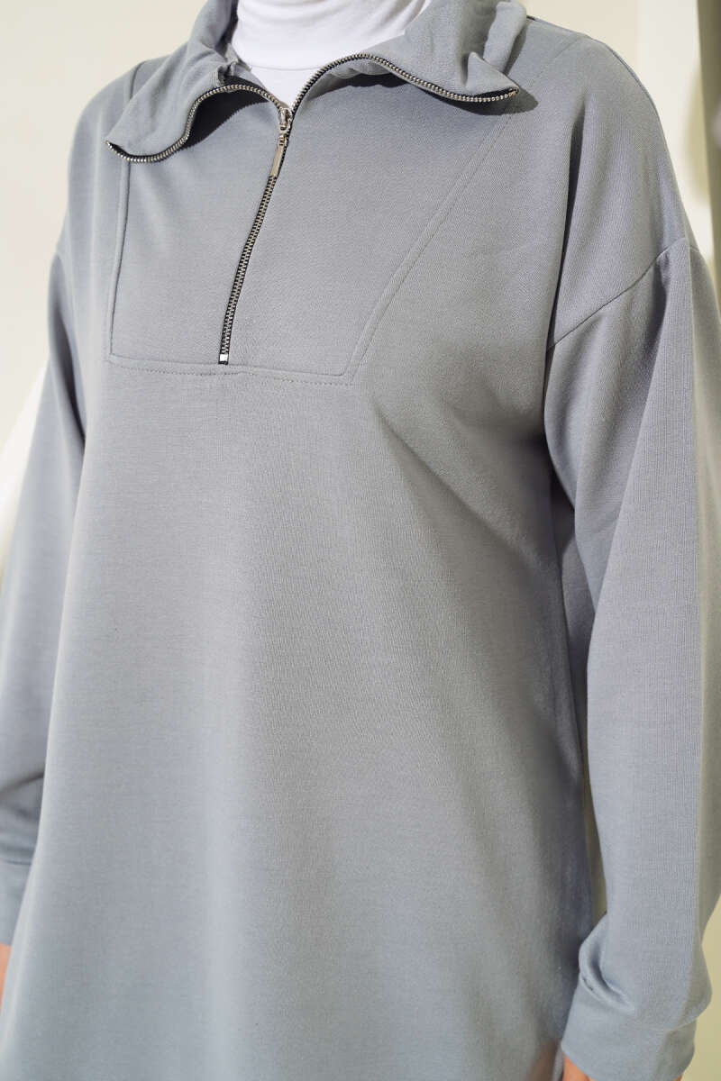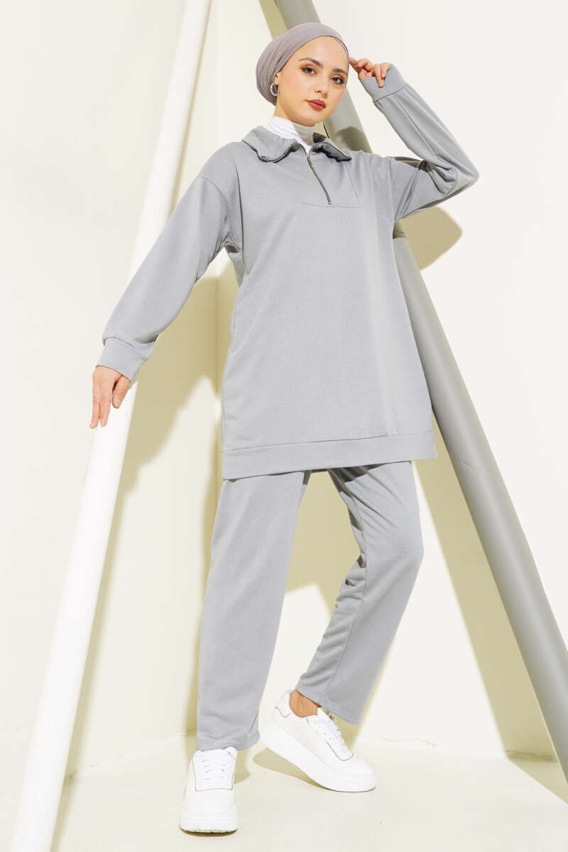 Taşlı Yaka Fermuarlı Scuba İkili Takım Ekru