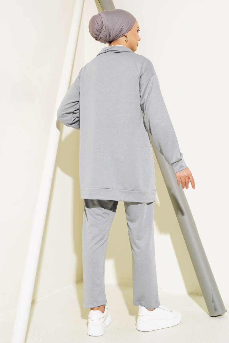 Önü Mini Düğmeli Elbise İkili Takım Füme