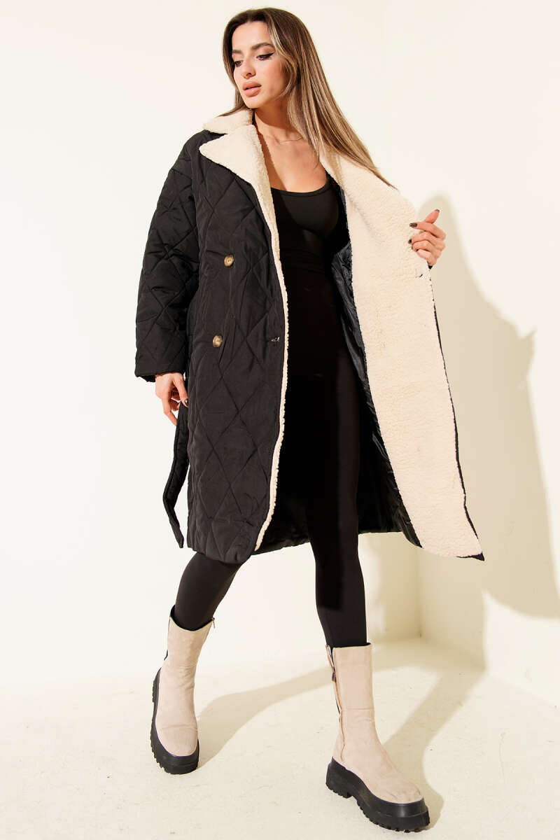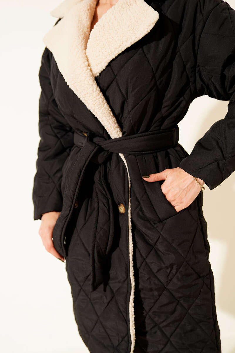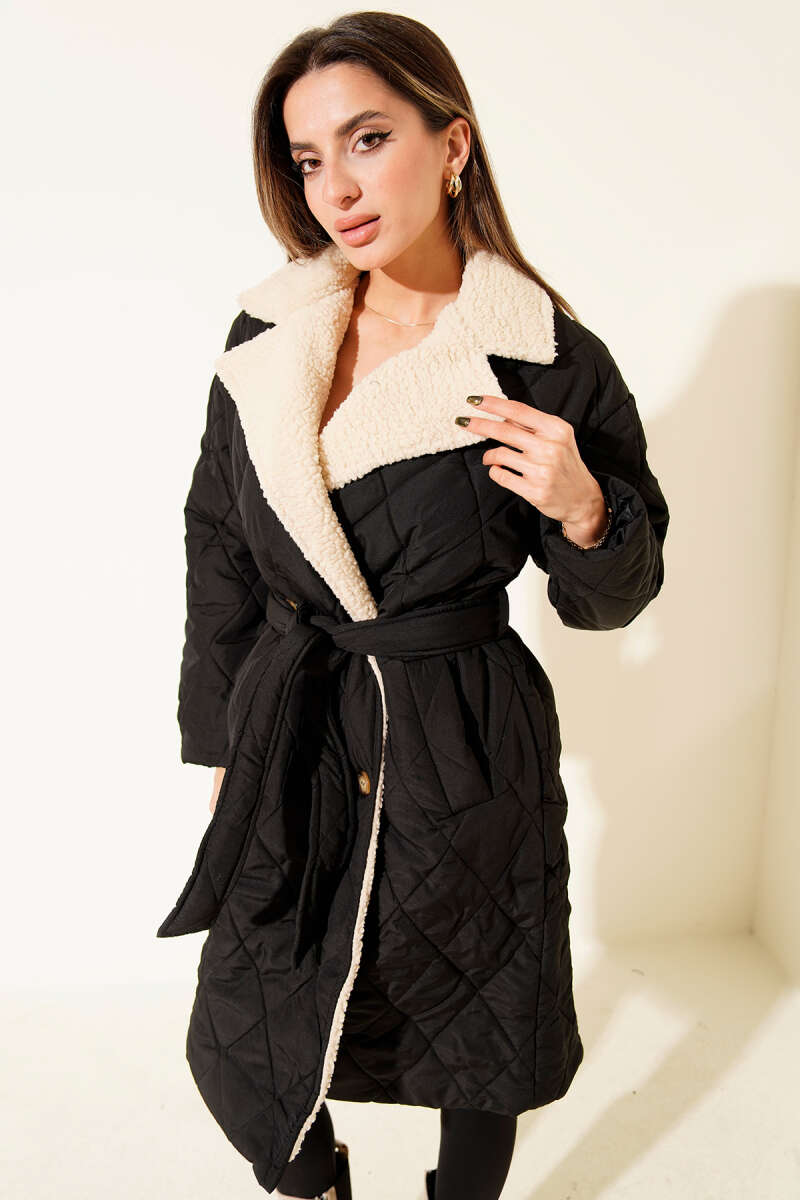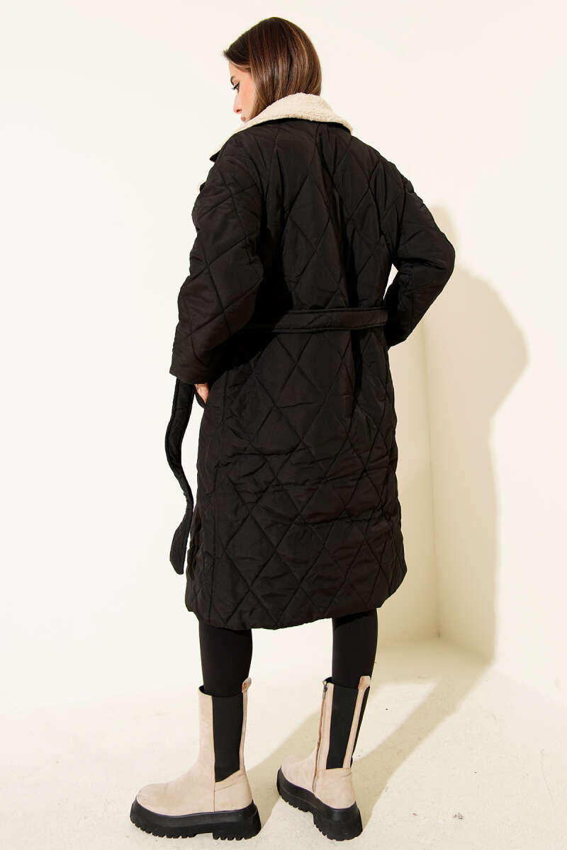 Yakası Yünlü Kuşaklı Mont Kahve