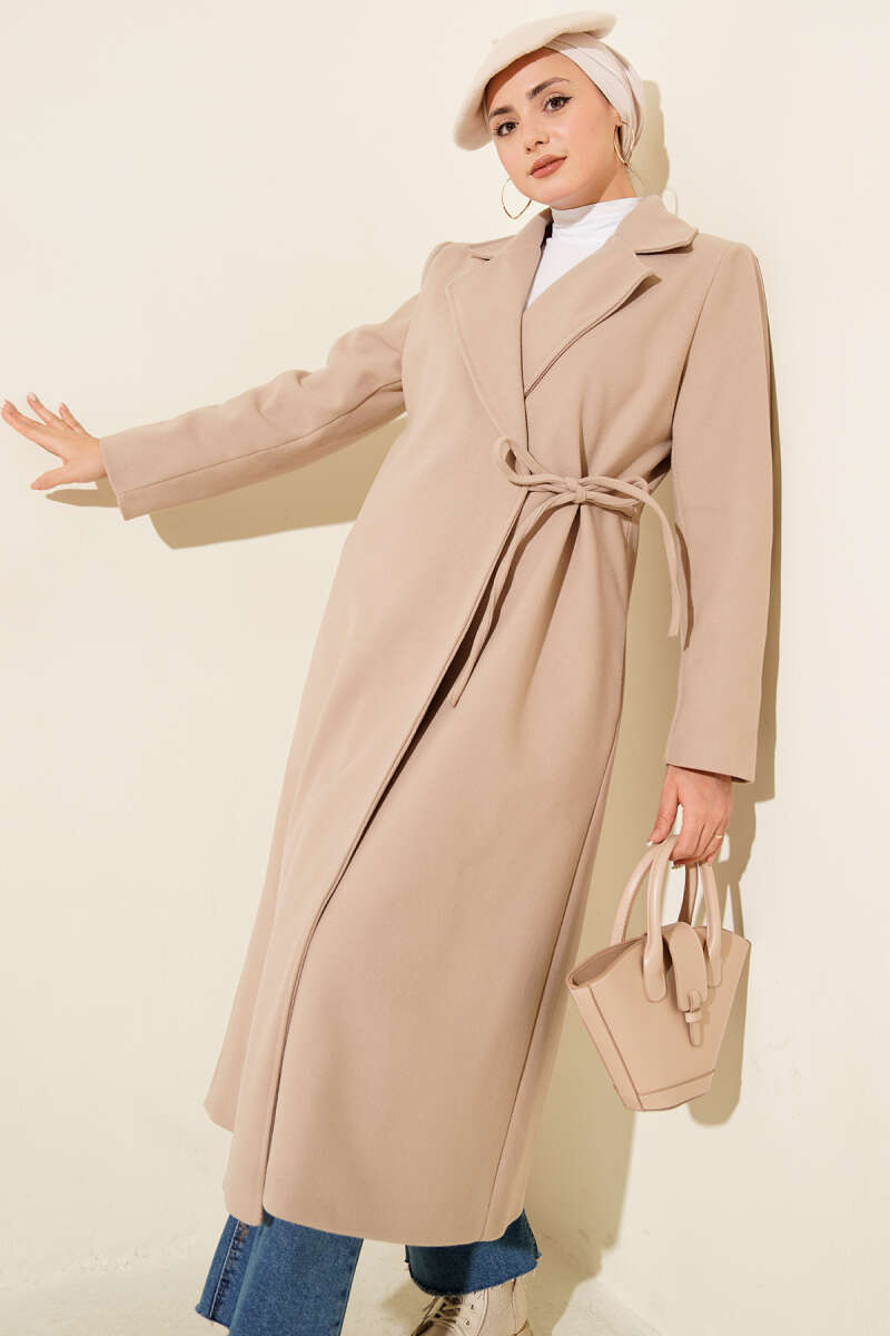 Yan Bağcıklı Kaşe Kaban Saks
