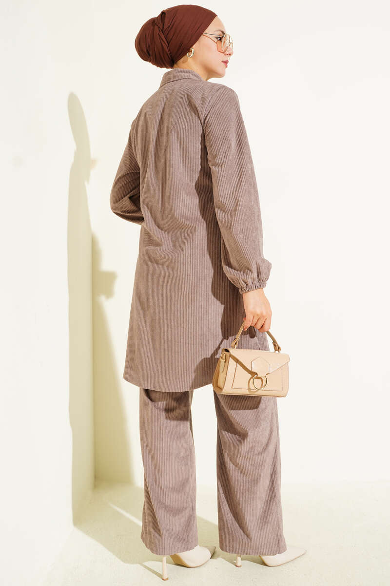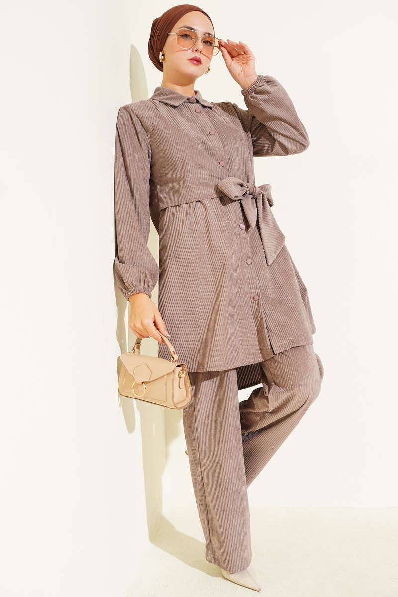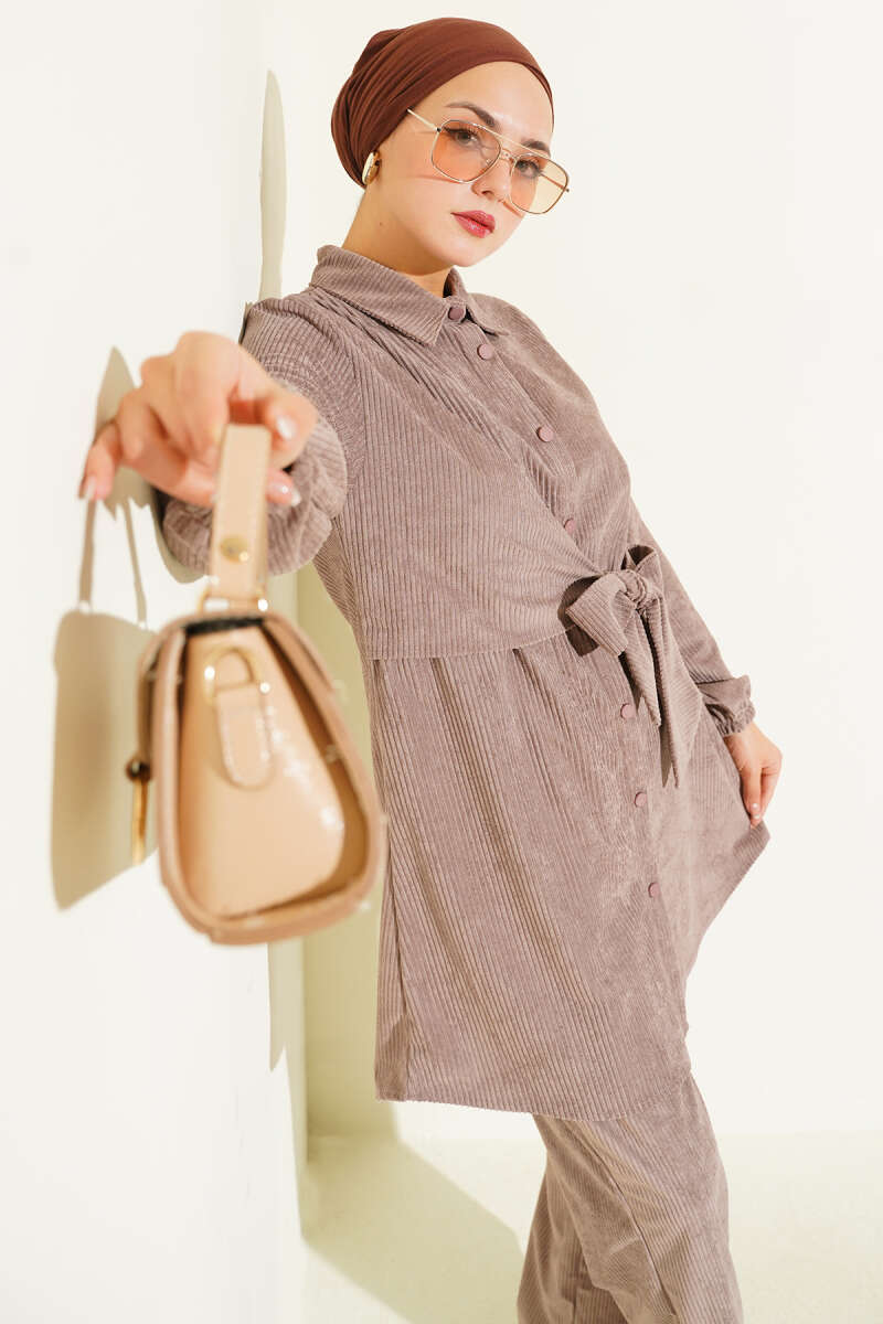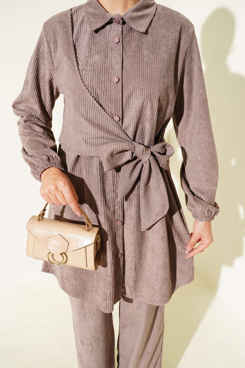 Kruvaze Yaka Kuşaklı İkili Takım Petrol