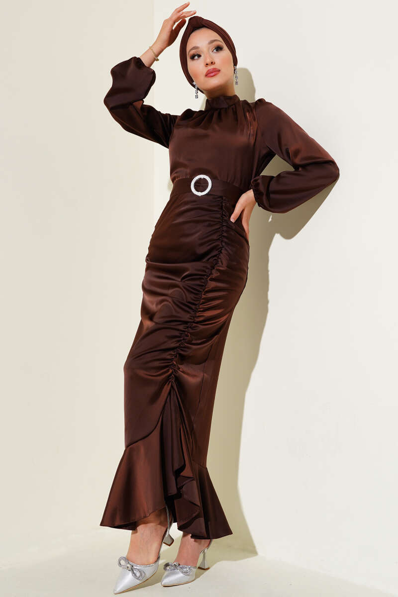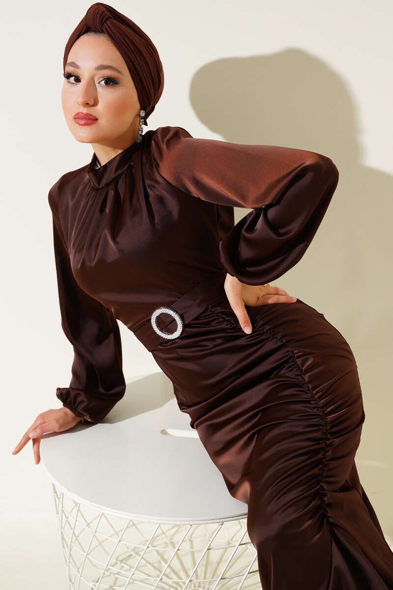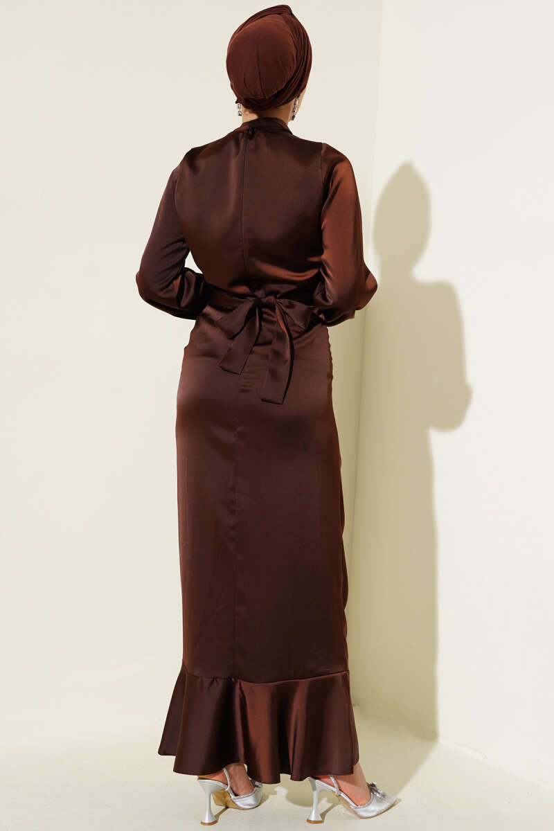 Kol Ucu Armalı İp Bağcıklı Elbise Kahve