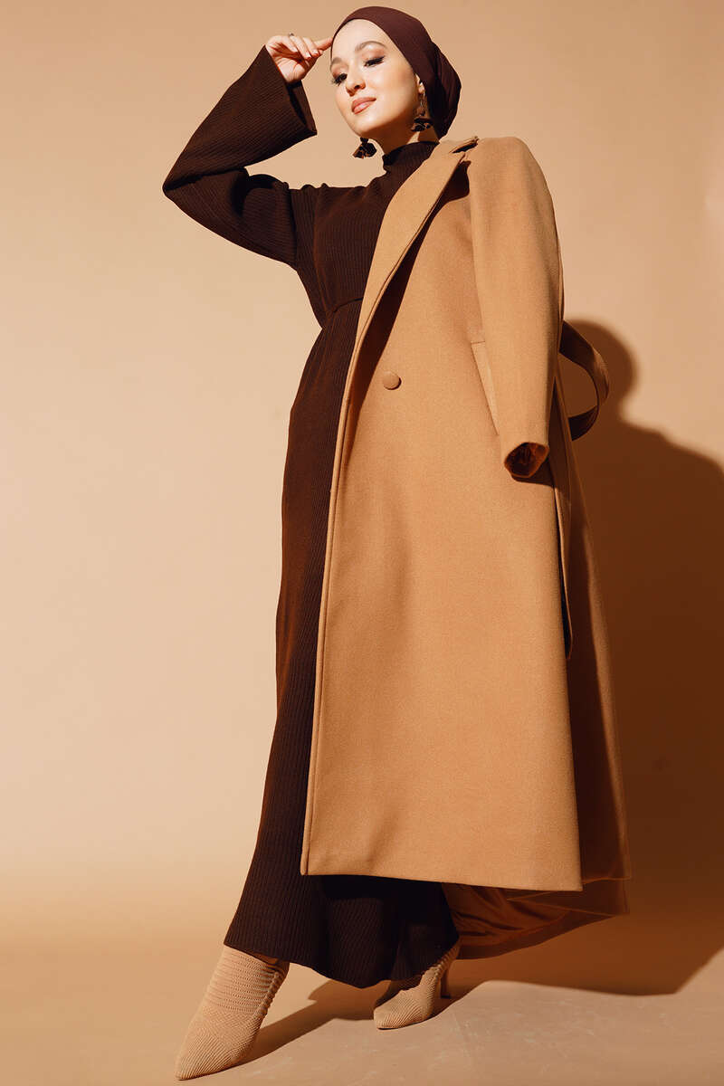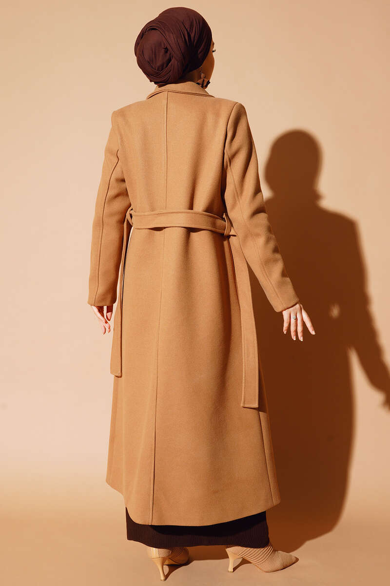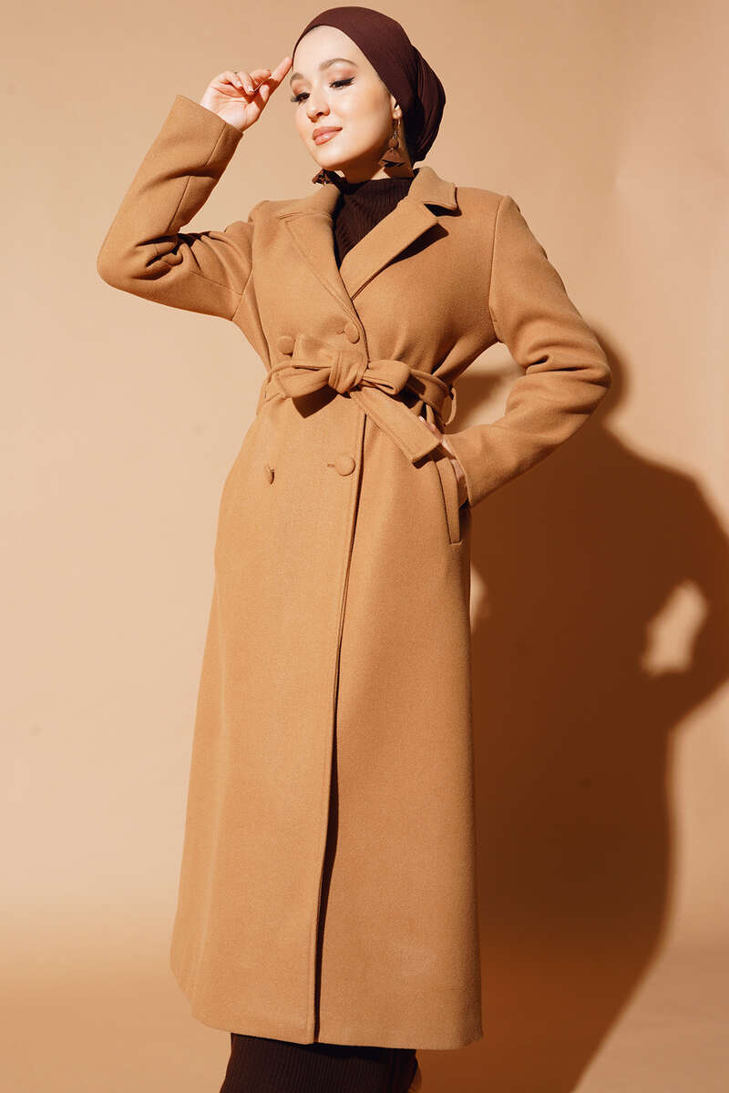 Yeni sezon şahane kabanımız şık duruşu ve yeni tarzıyla bu sezonun en göz alıcı modeli olacak. İçi astarlı olan kabanımızın dik kruvaze yakası ayrı bir hava katmıştır. İki düğmeli kabanımızn beli kuşaklıdır. İki adet kemer köprüsü bulunmaktadır.