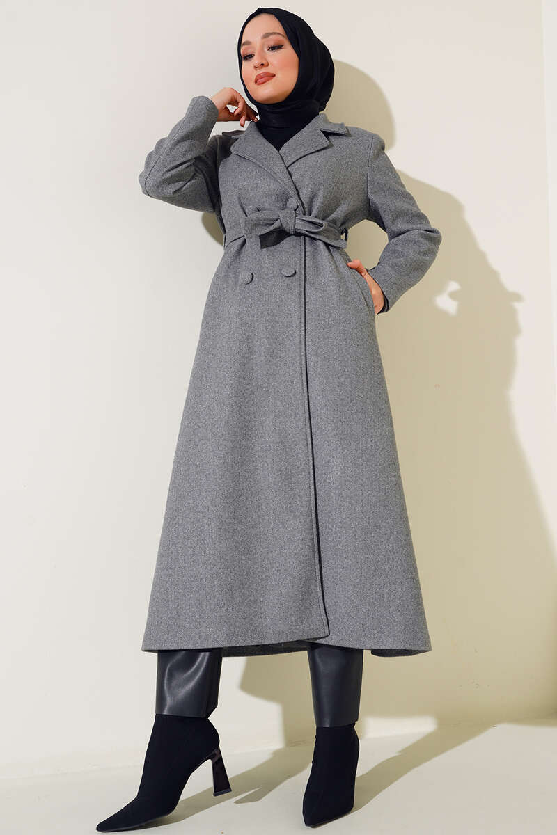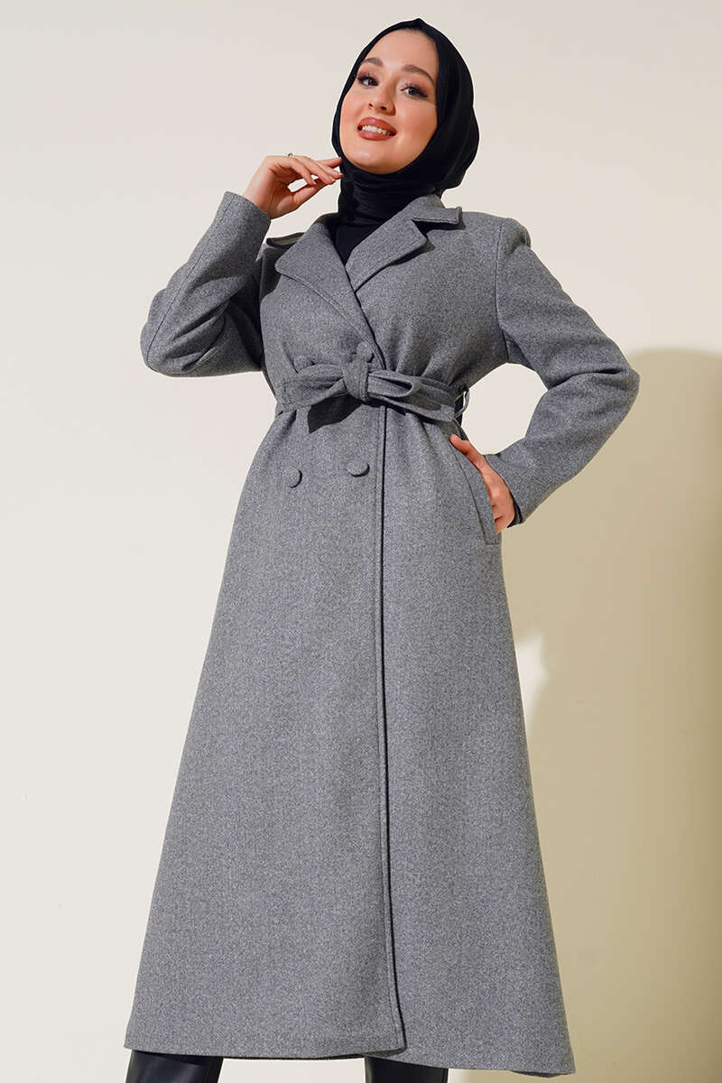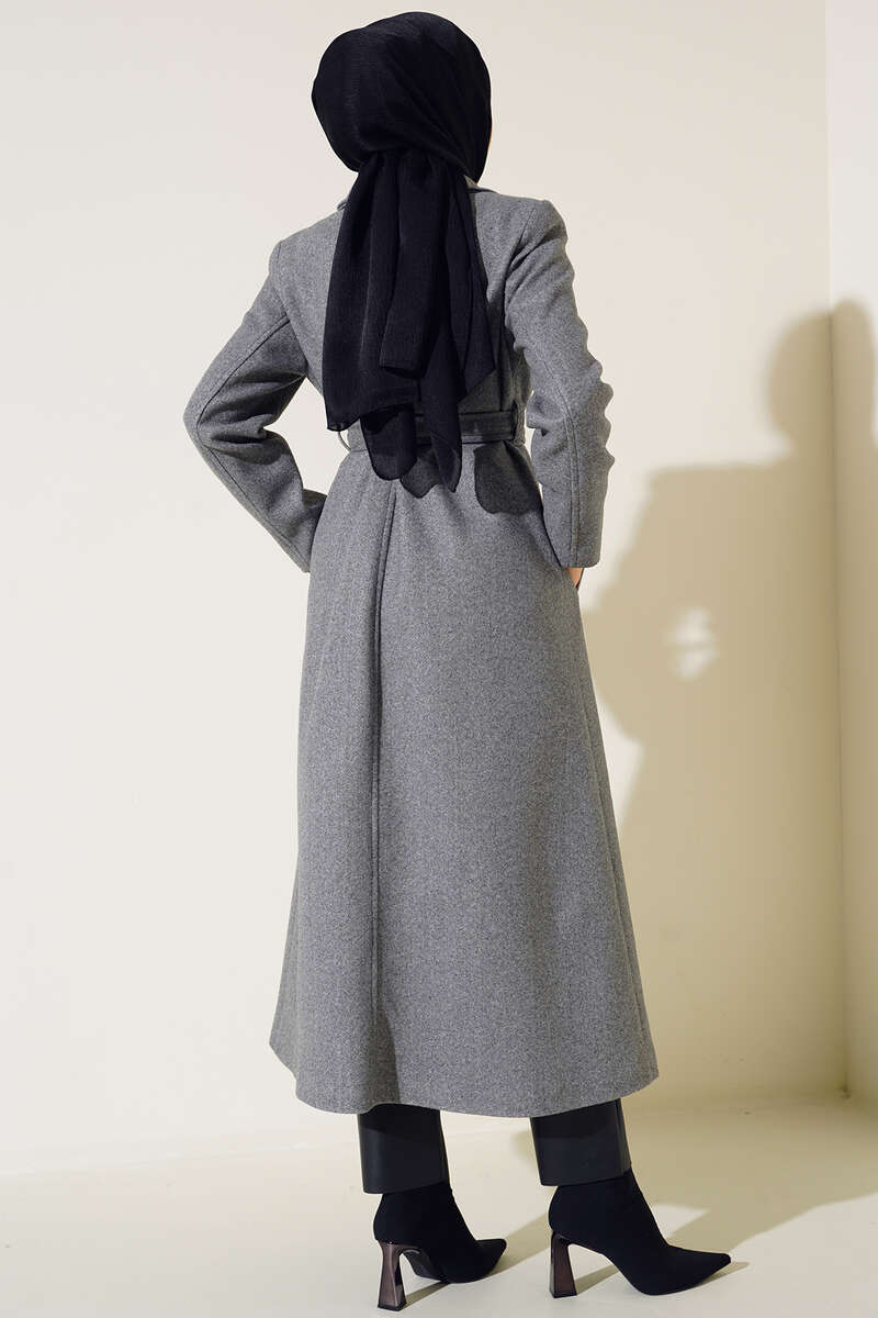 Yan Cepli Düğmeli Uzun Kaşe Kaban Füme