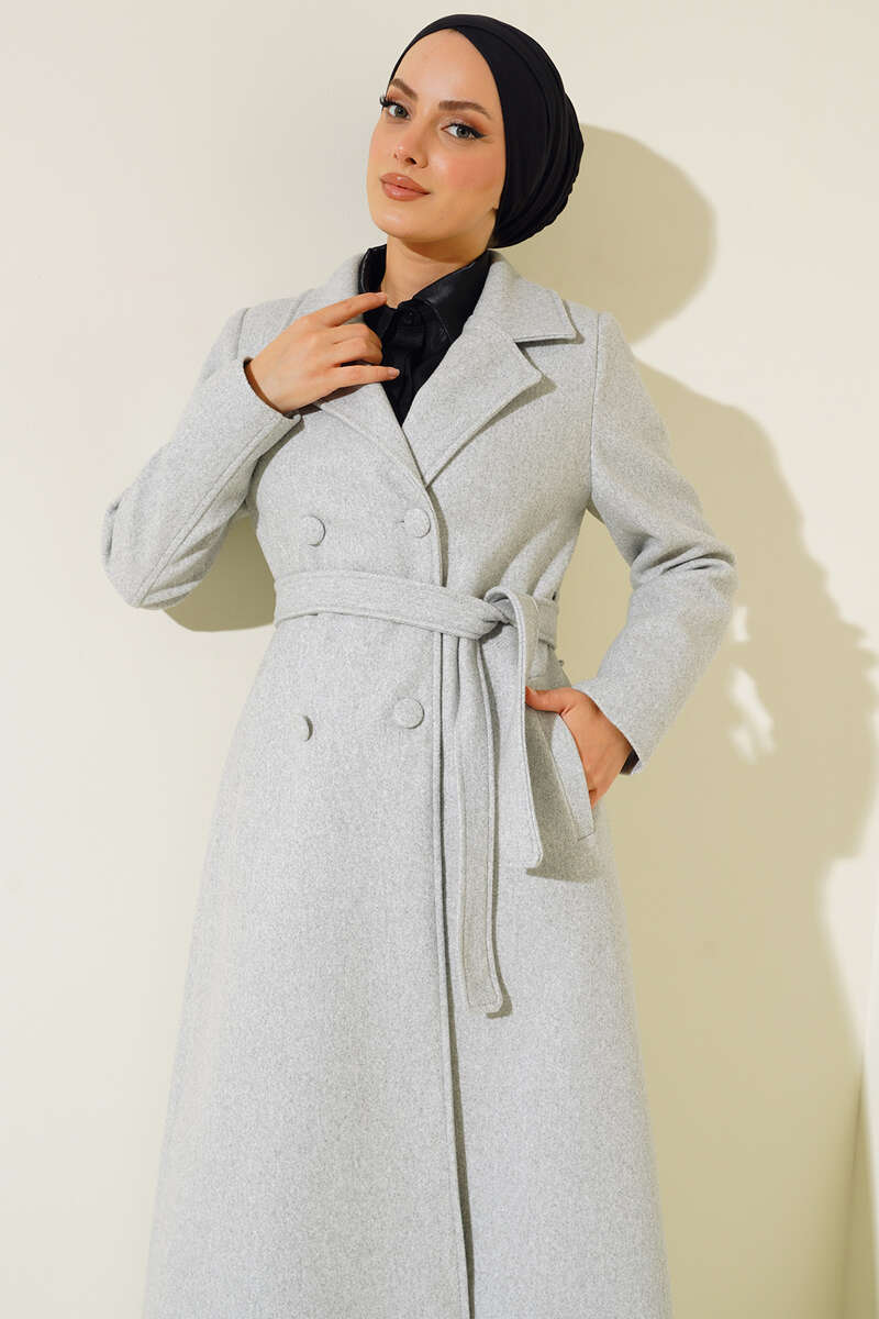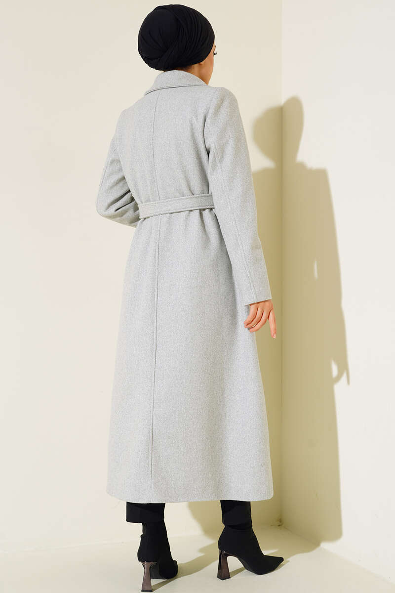 Yan Cepli Düğmeli Uzun Kaşe Kaban Gri