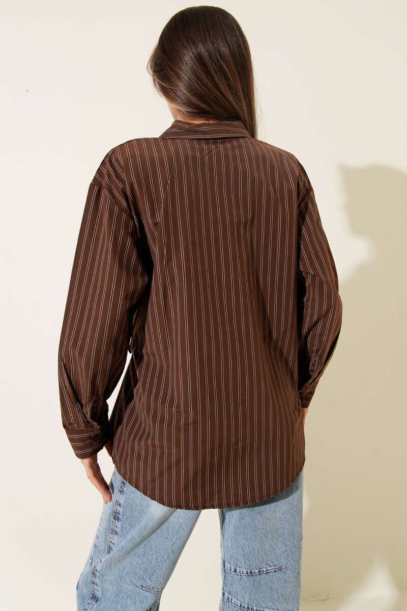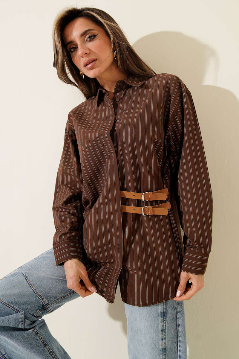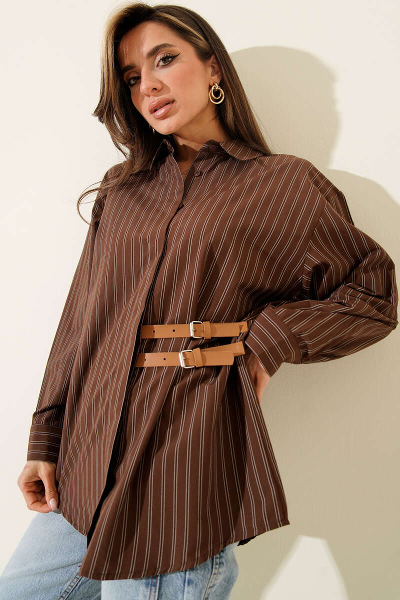 Yan Çift Kemer Detaylı Çizgili Gömlek Kahve