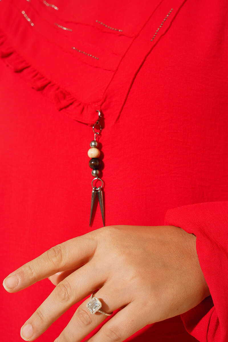 Yeni sezon tuniğimiz önü boncuk desenli göğüs kısmında sallanan aksesuarı vardır. Bisiklet yakadır. Etek kısımları oval kesimdir. Bilekleri lastiklidir. ense düğmelidir.