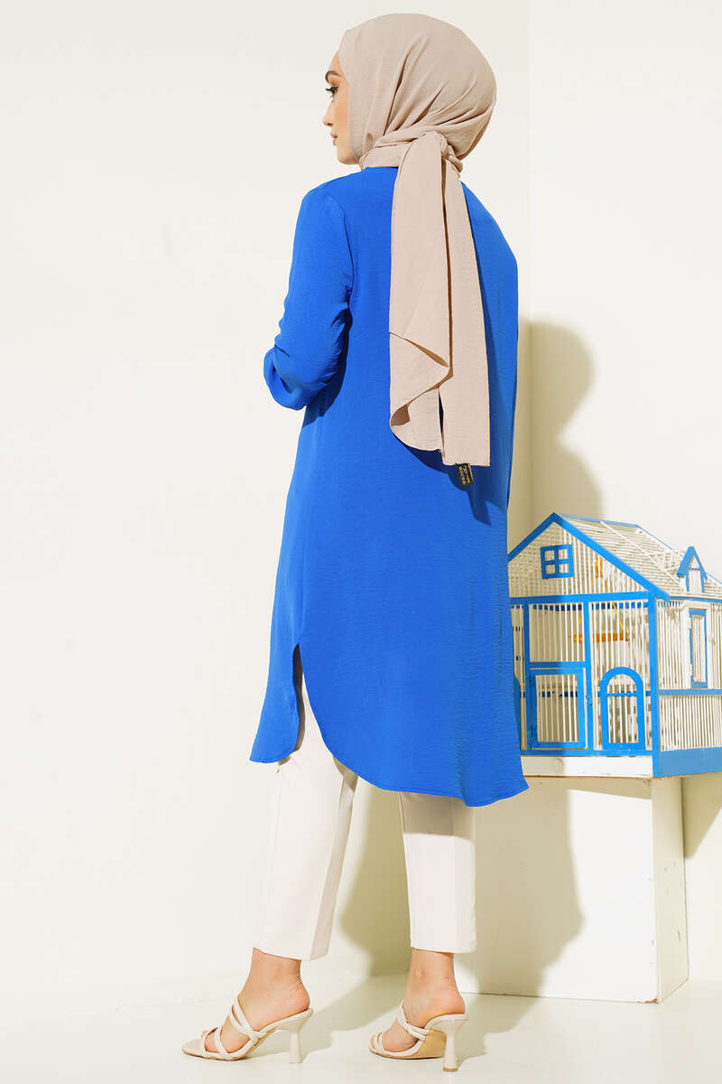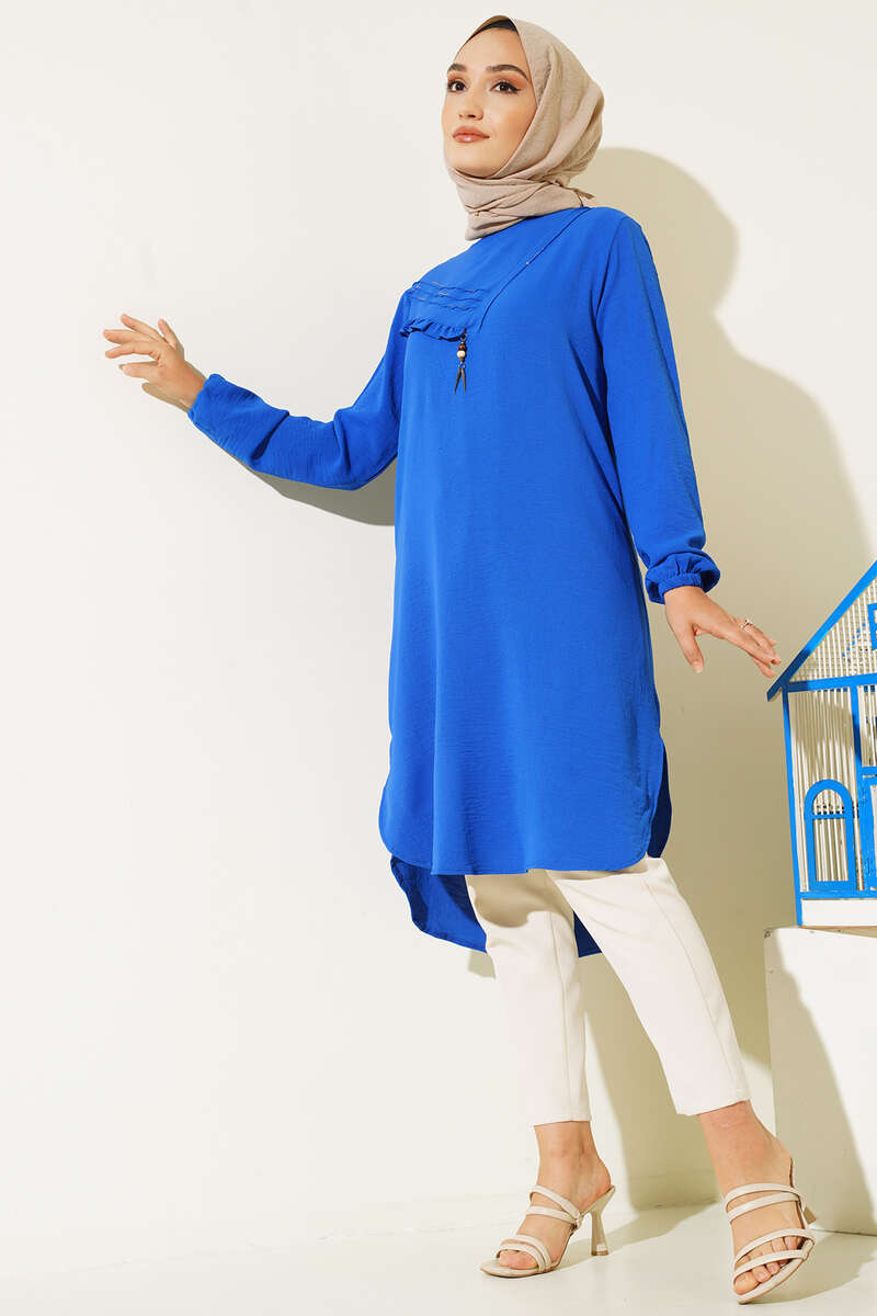 Yeni sezon tuniğimiz önü boncuk desenli göğüs kısmında sallanan aksesuarı vardır. Bisiklet yakadır. Etek kısımları oval kesimdir. Bilekleri lastiklidir. ense düğmelidir.