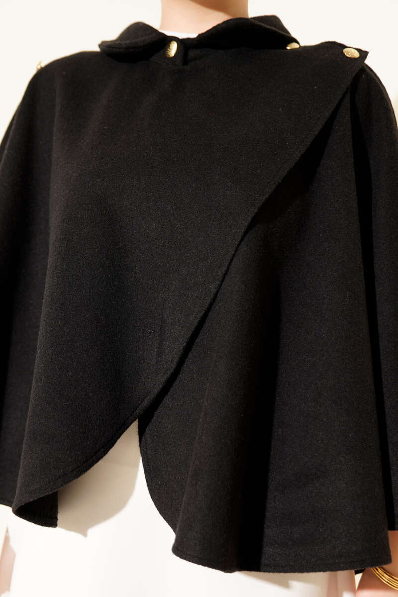 Dik Yaka Gold Düğmeli Kaşe Panço Siyah