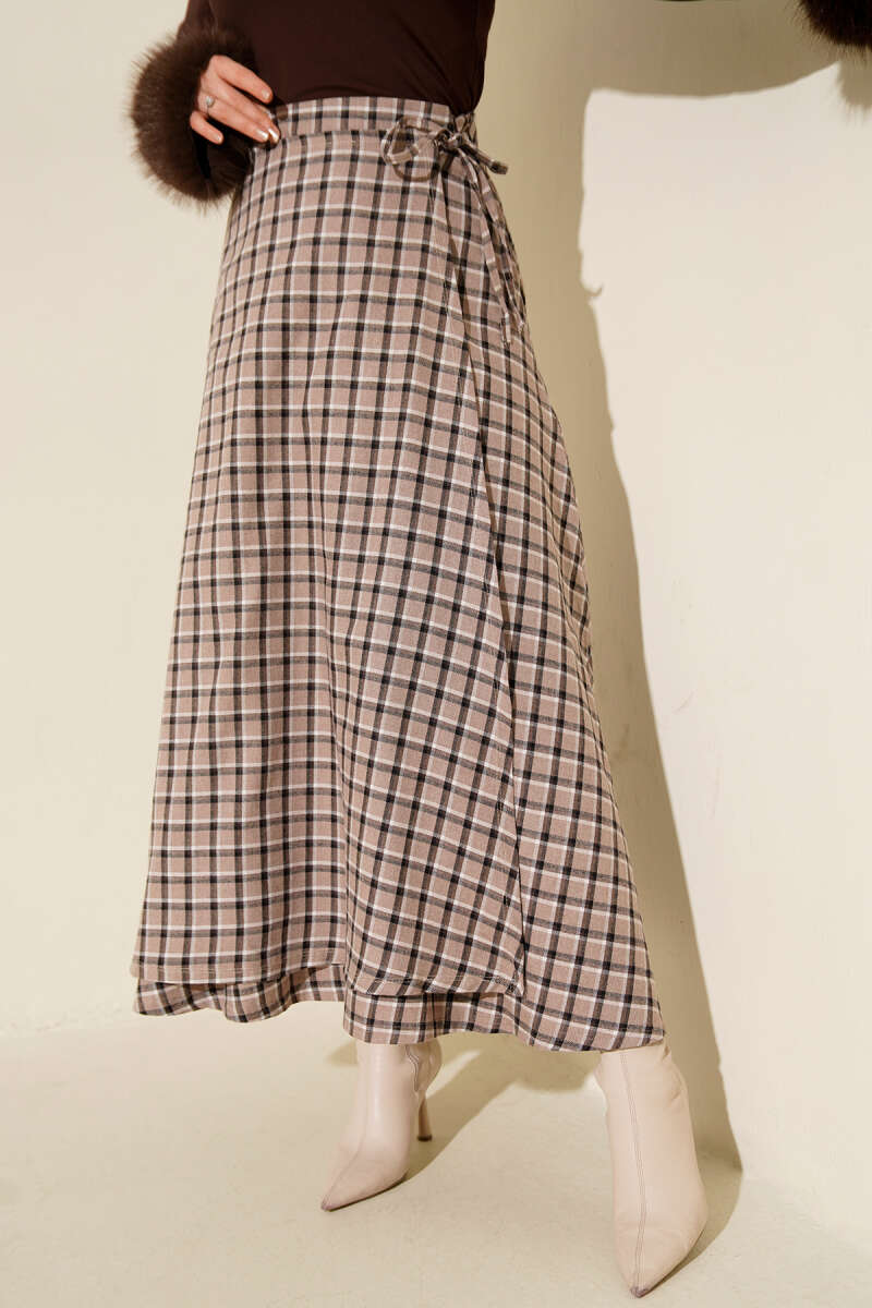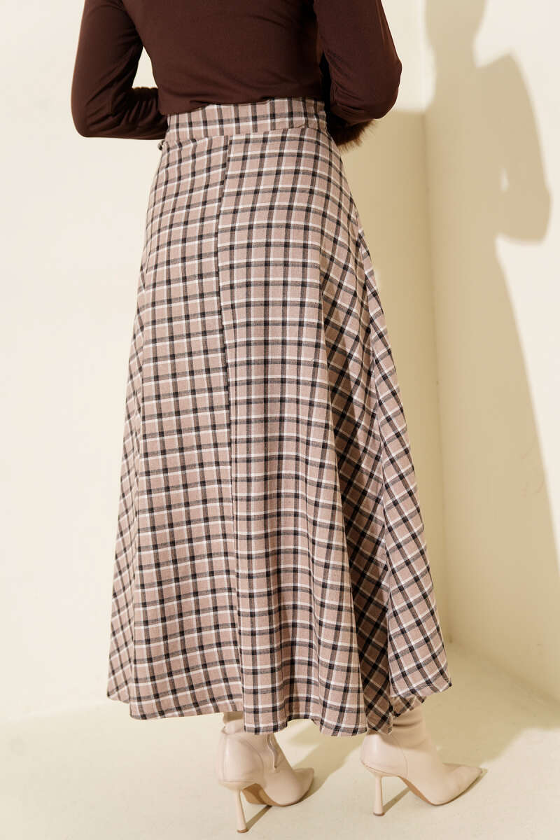 Ekoseli Cepli Kloş Etek Bej
