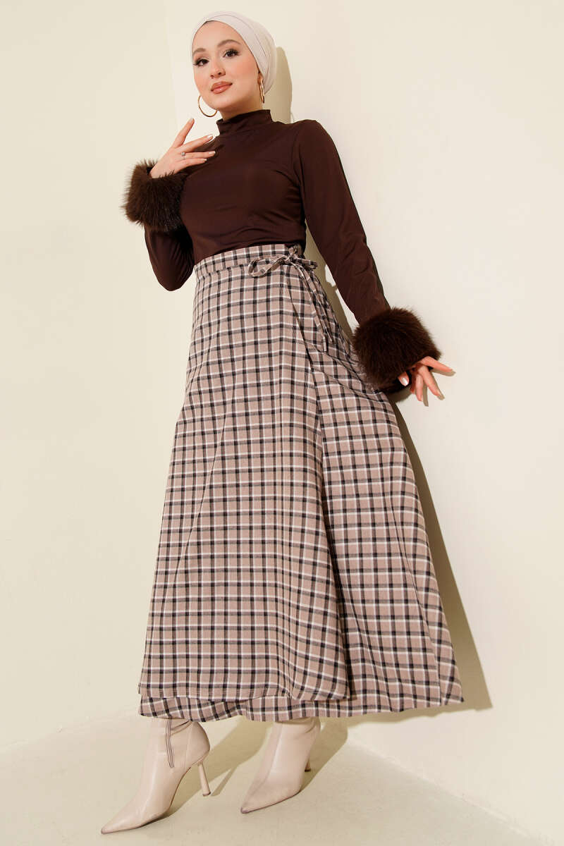 Beli Lastikli Ekoseli Basic Etek Kahve