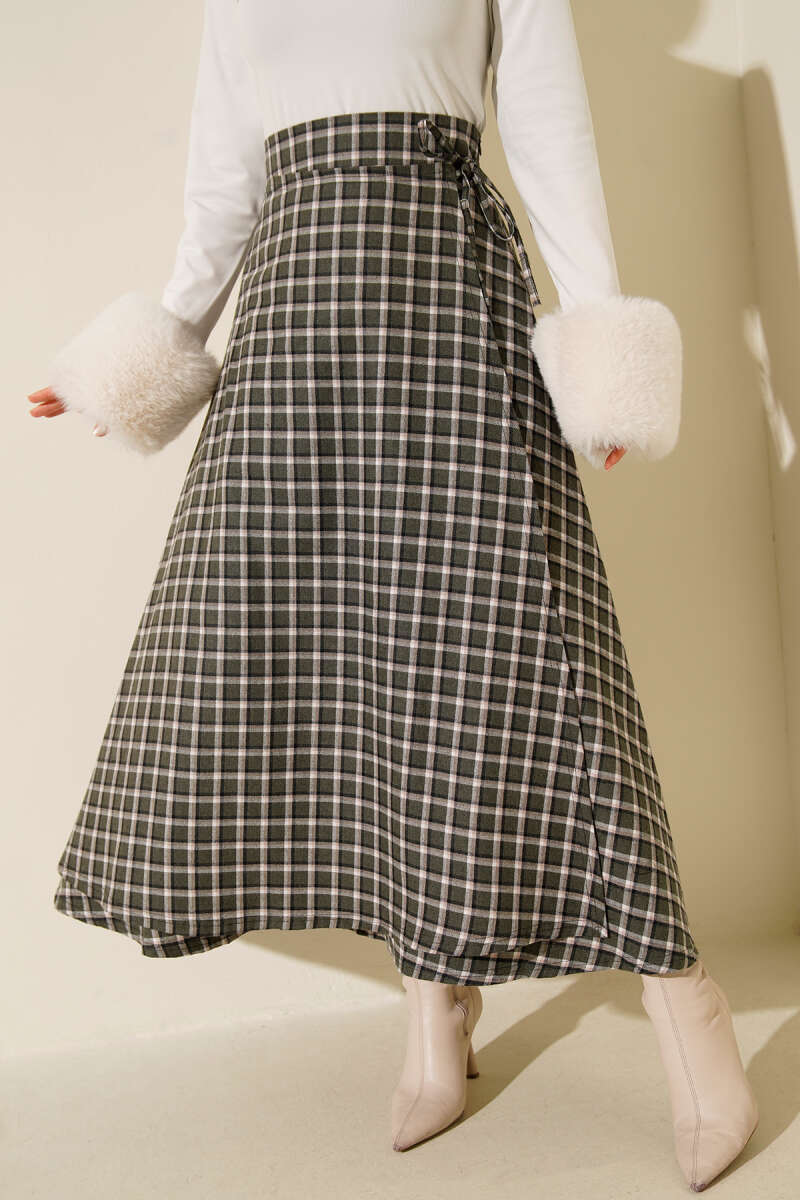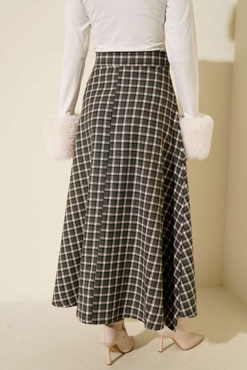 Ekoseli Cepli Kloş Etek Haki