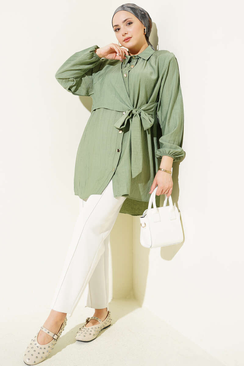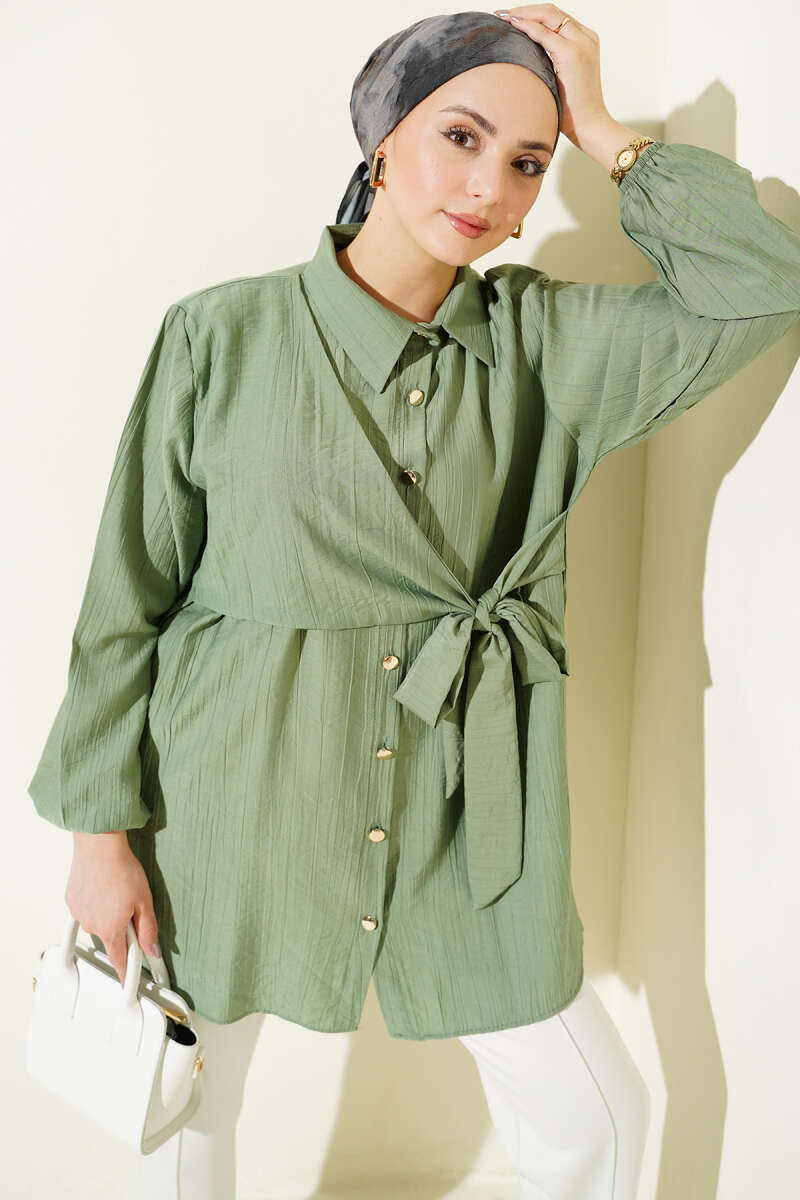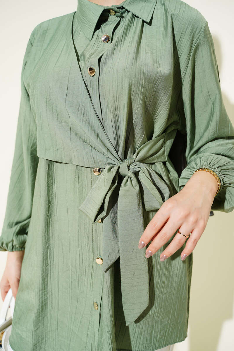 Çift Yaka İp Kuşaklı Gömlek Petrol