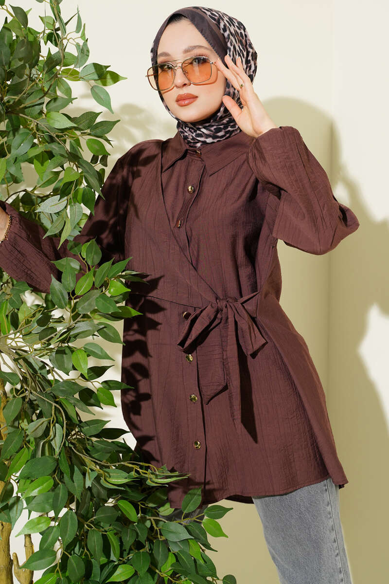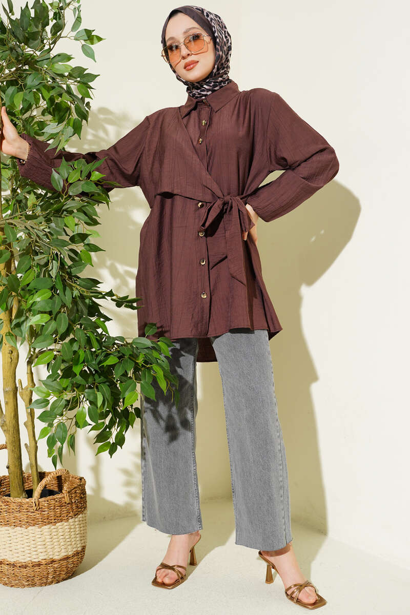 Geniş Kollu Oversize Uzun Gömlek Kahve
