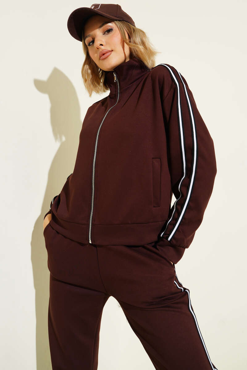 Yan Şeritli Fermuarlı İkili Takım Kahve