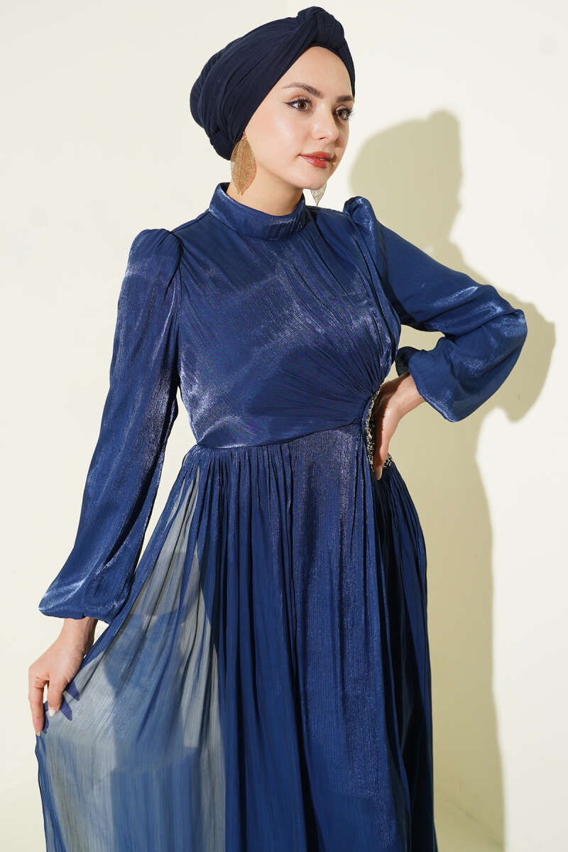Bilek Bağlamalı Kuşaklı Abiye Elbise Lacivert