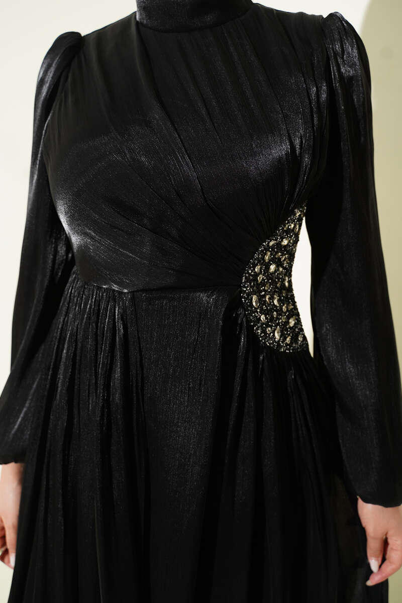 Yan Büzgülü Gold Tokalı Saten Abiye Siyah