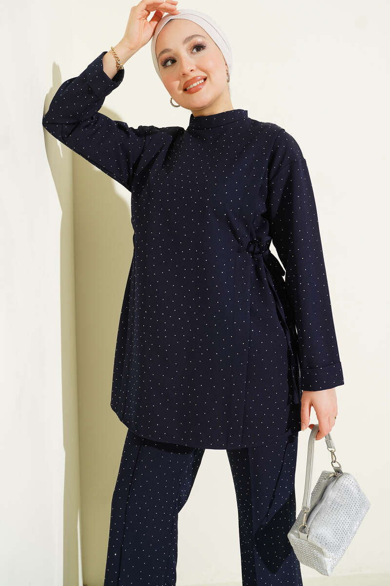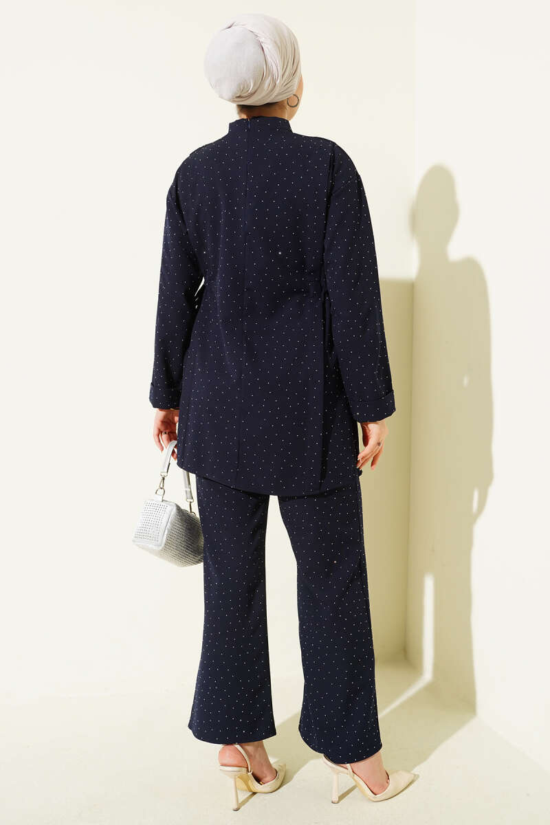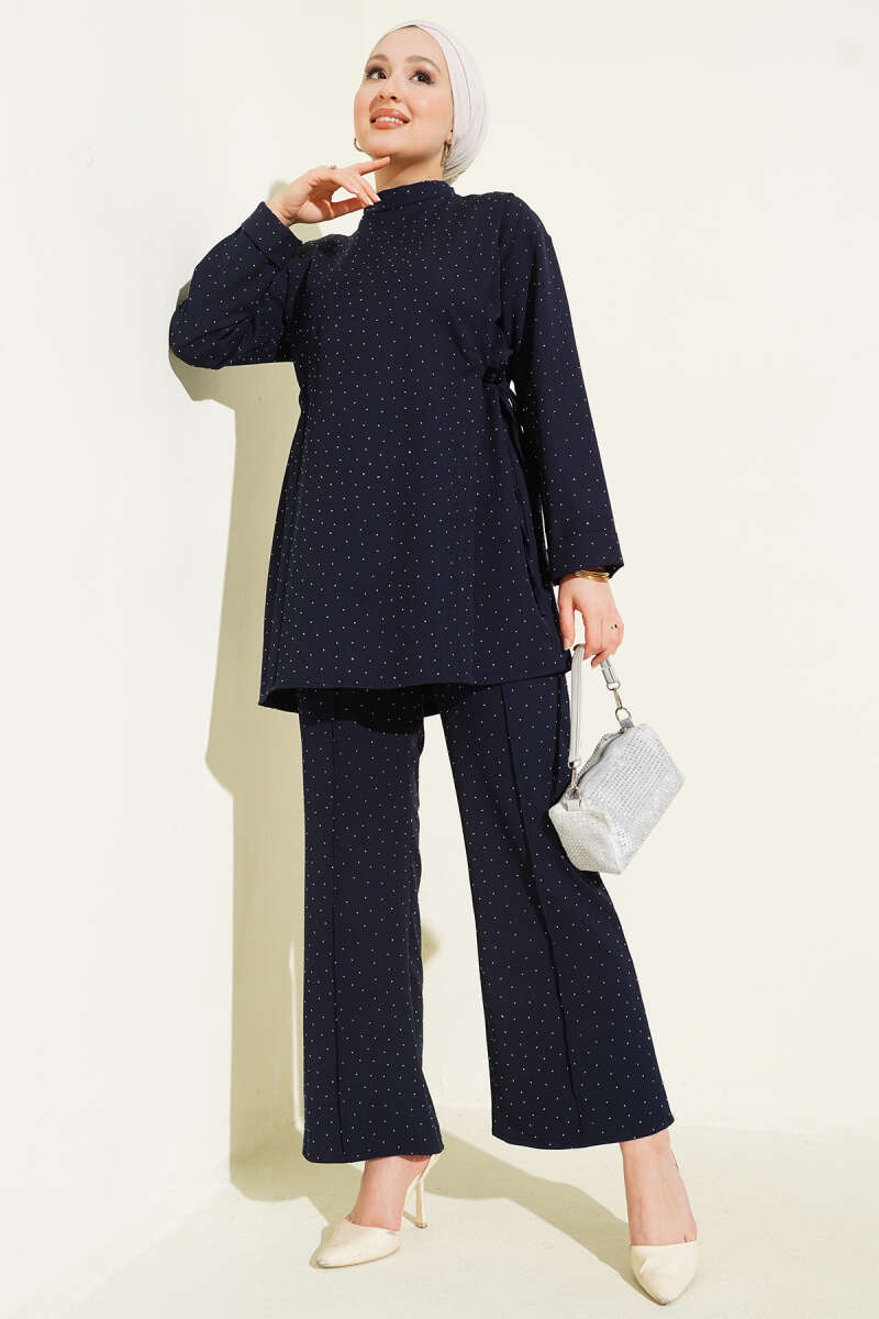 Yan Tünelli Taş Süslemeli İkili Takım Lacivert
