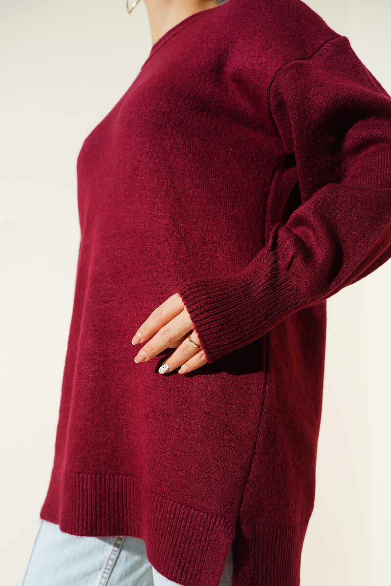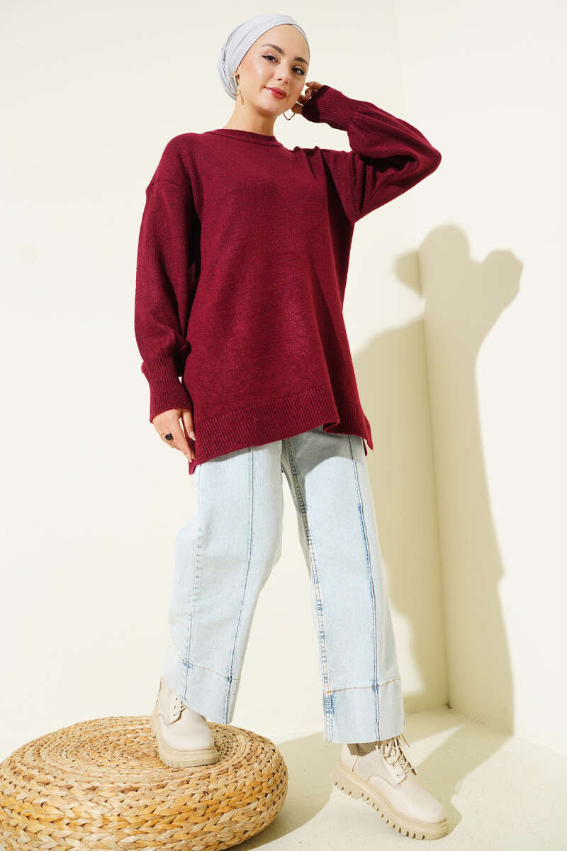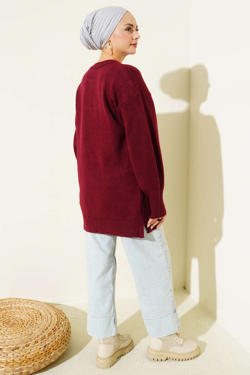 Yaka Çiçekli Yumoş Triko Tunik Bordo
