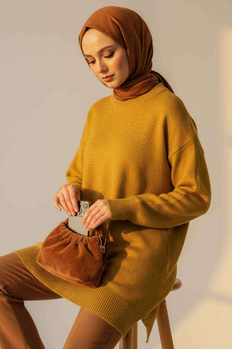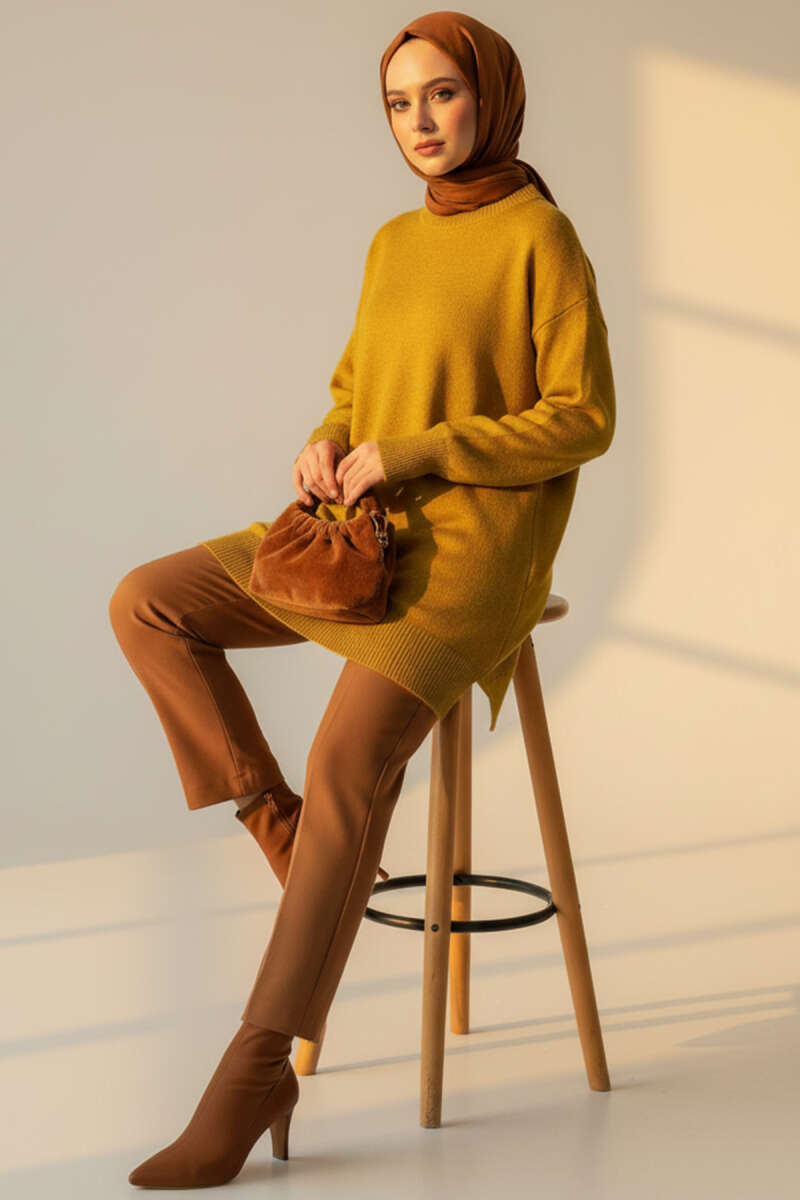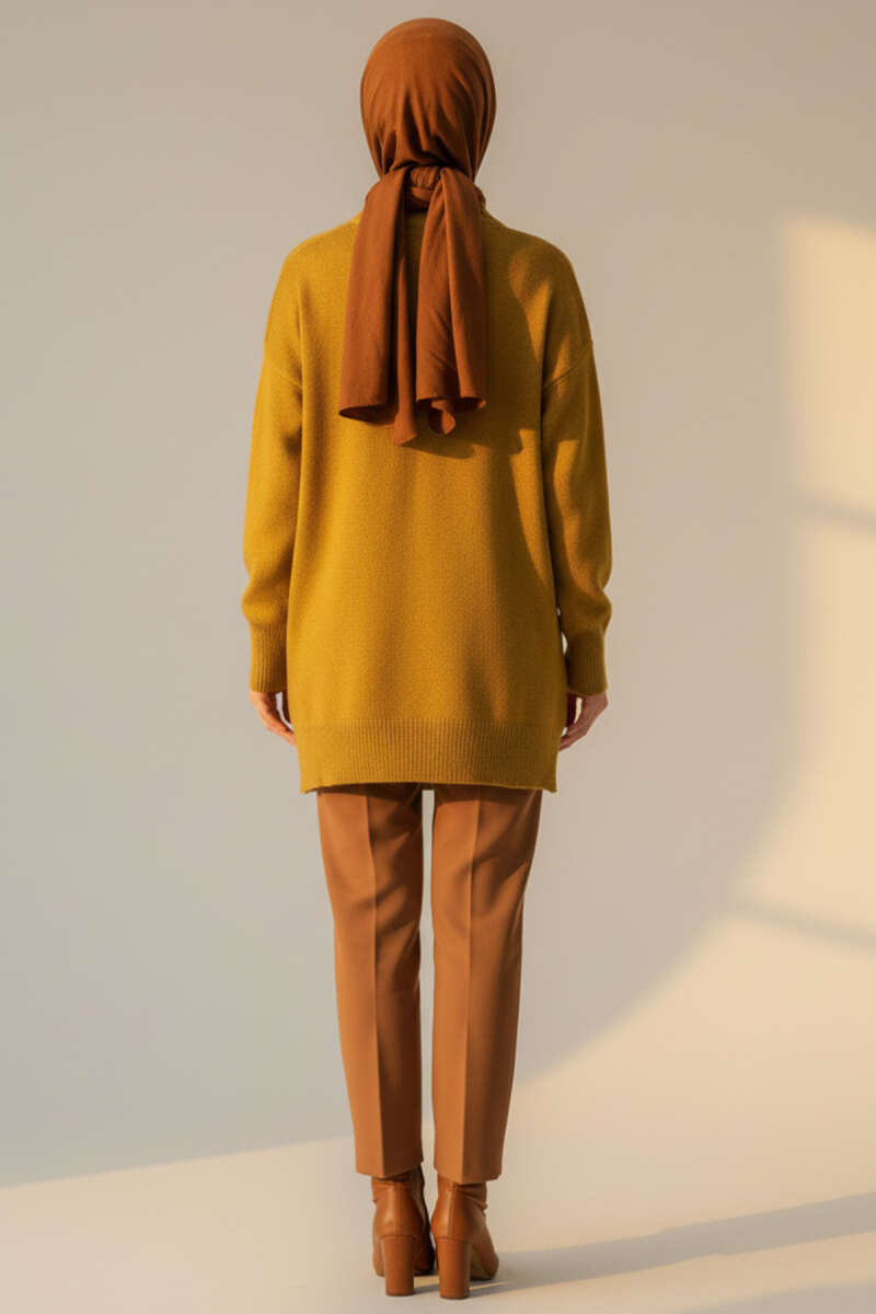 Yan Yırtmaçlı Yumoş Uzun Triko Tunik Yağ Yeşili