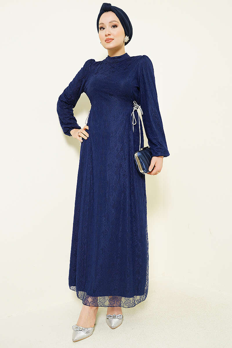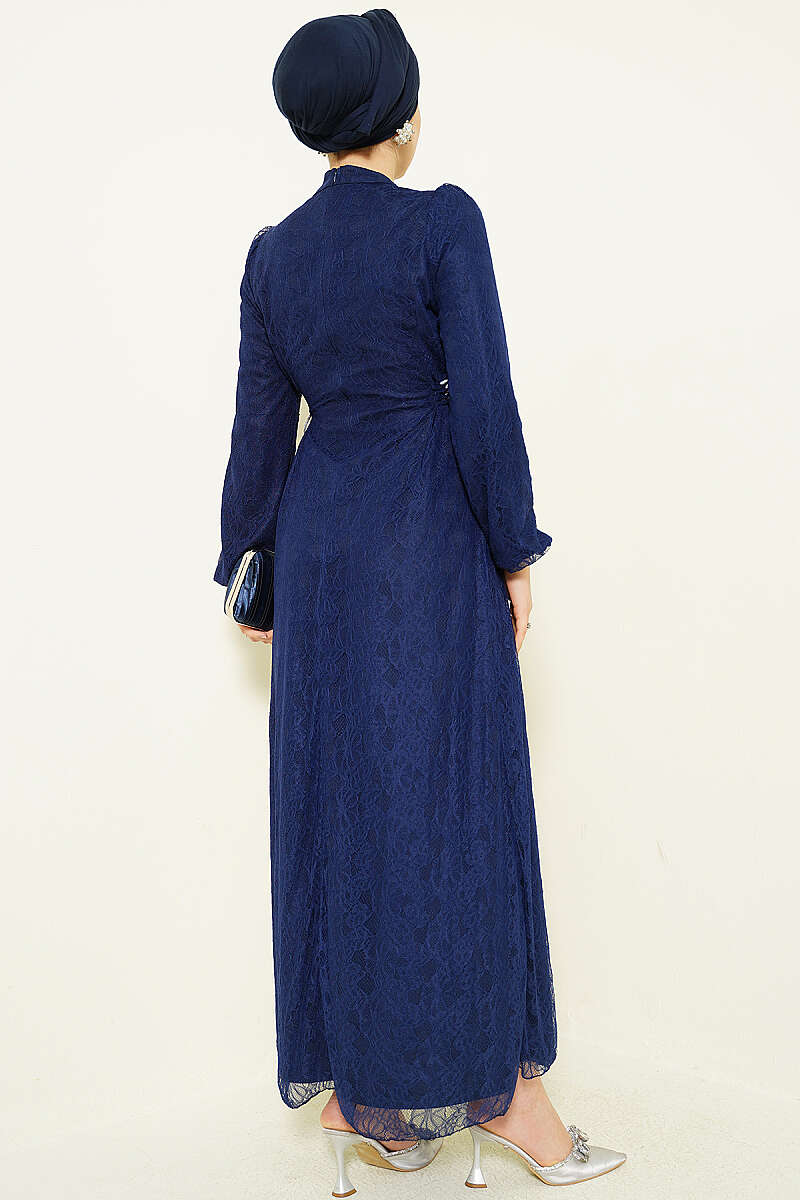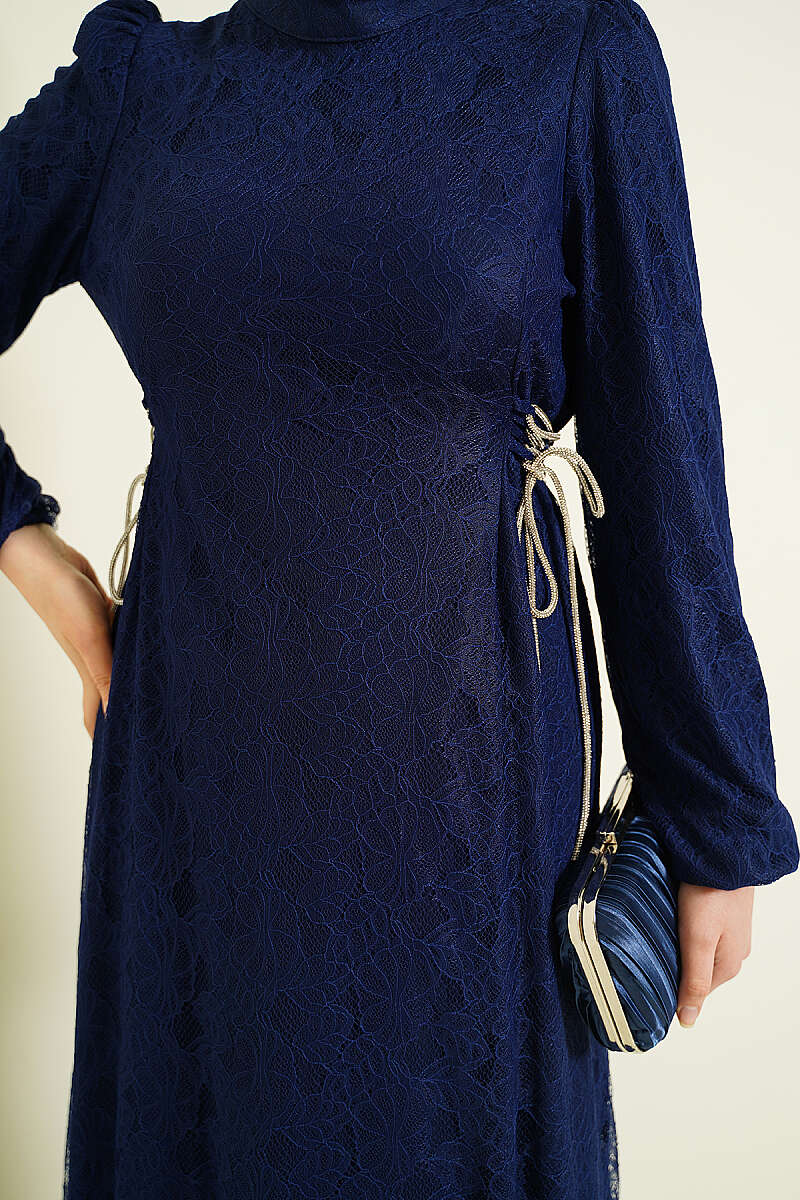 Yandan Bağlamalı Dantelli Abiye Elbise Lacivert