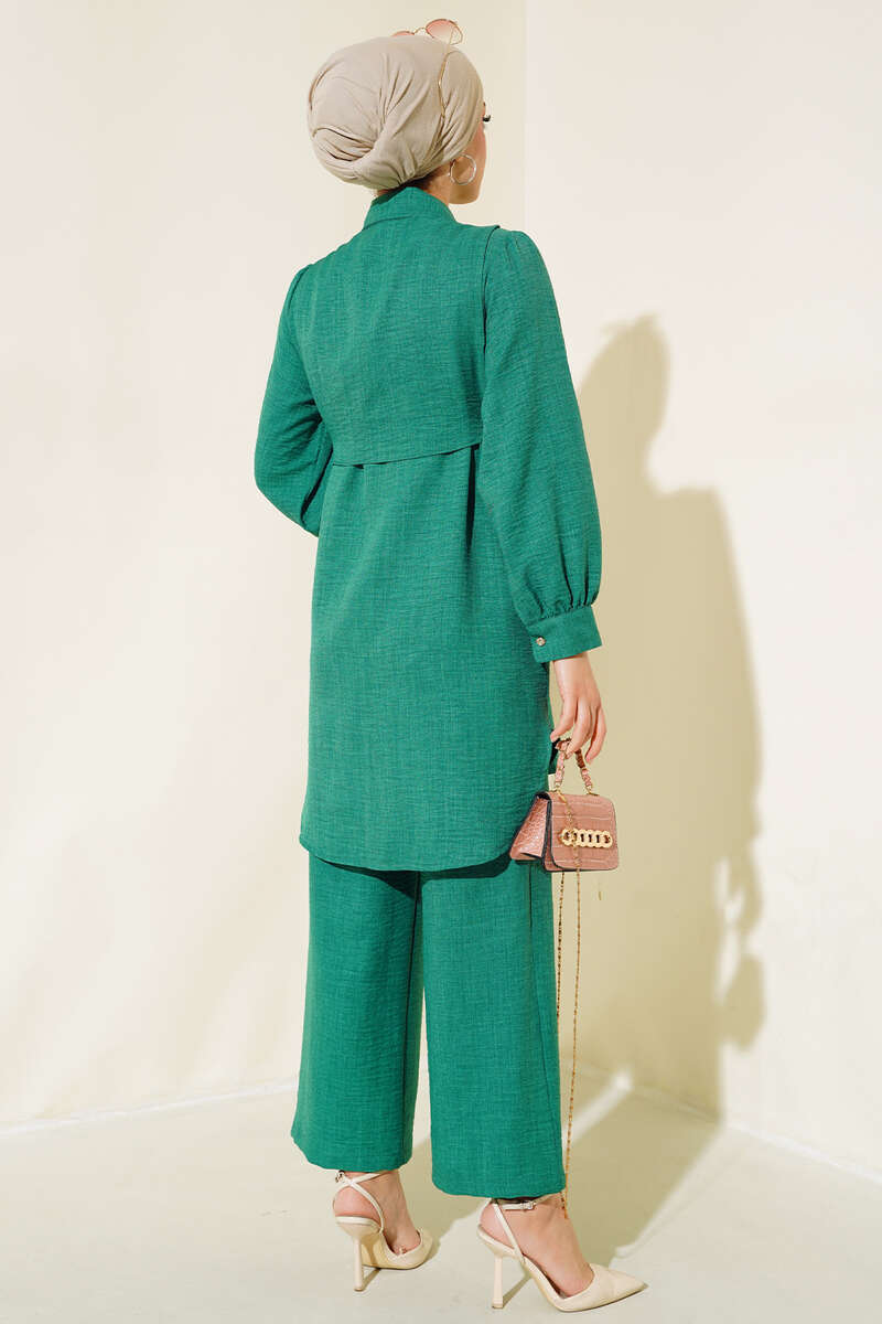 Yeni sezon ikili takım modelimiz sizlerle beraber. Tuniğimiz pelerinlidir. Yanları bağlamalıdır. Tuniğimiz boydan düğmelidir. Kol bilekleri manşetli ve düğmelidir. Önü kısa arkası uzundur. Pantolonumuzun beli lastiklidir. Bol paçadır. Hem sade hem şık ikili takımımız renk seçenekleriyle sizi beklemektedir.
