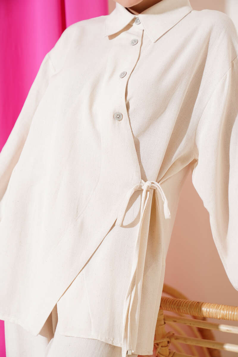 Yandan Bağlamalı Keten İkili Takım Bej