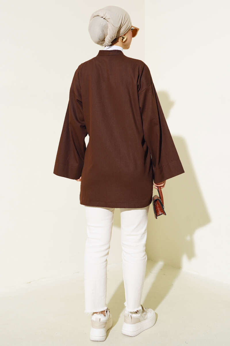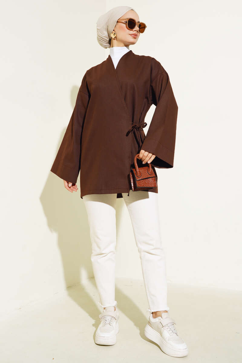 Yandan Bağlamalı Keten Kimono Kahve