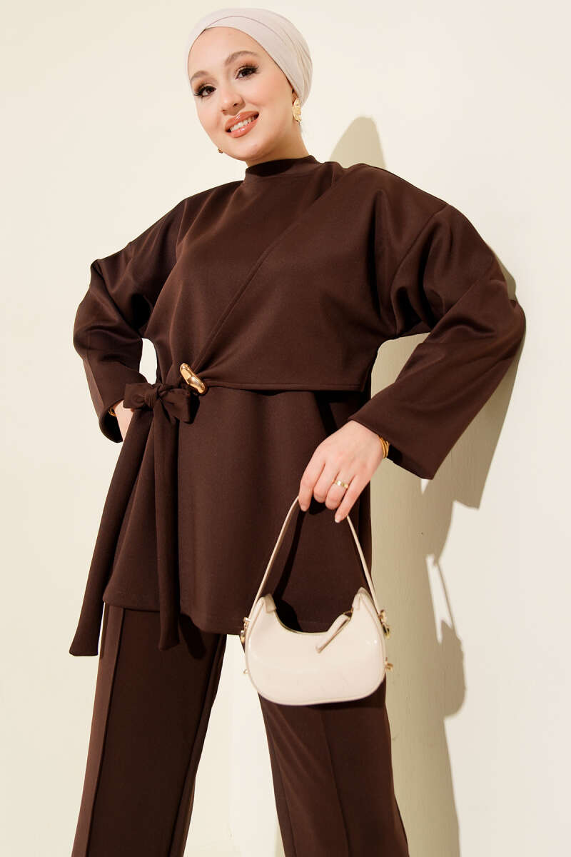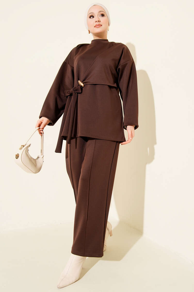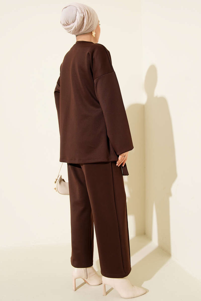 Dikiş Detaylı Basic Triko İkili Takım Kahve