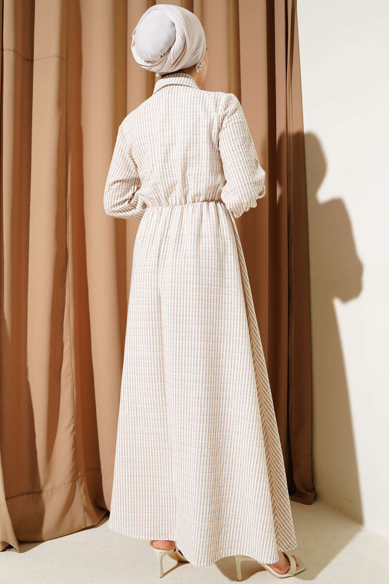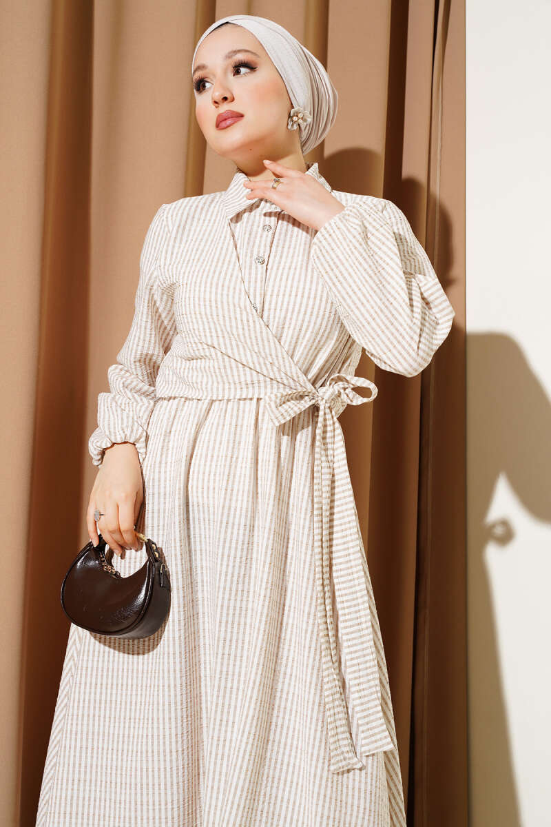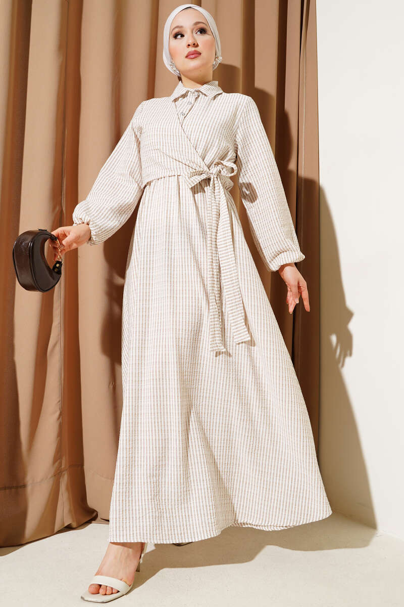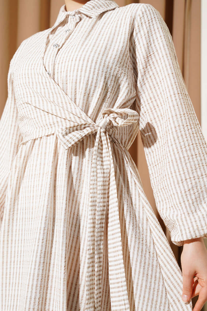 Çift İp Kuşaklı Ekoseli Elbise Bej