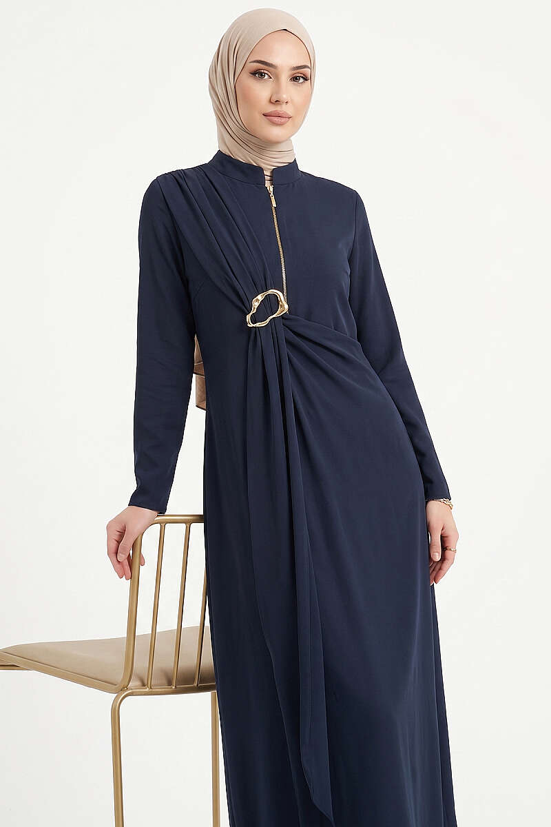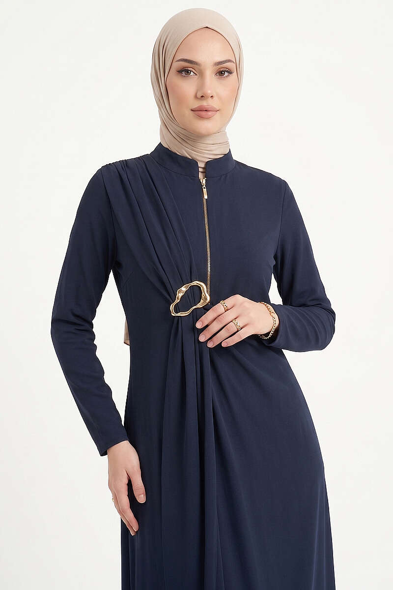 Yandan Bronşlu Büzgülü Elbise Lacivert