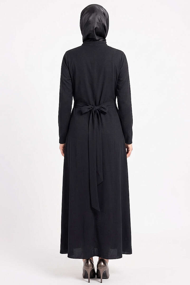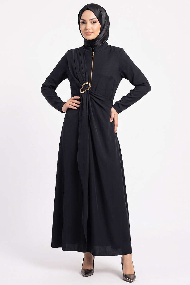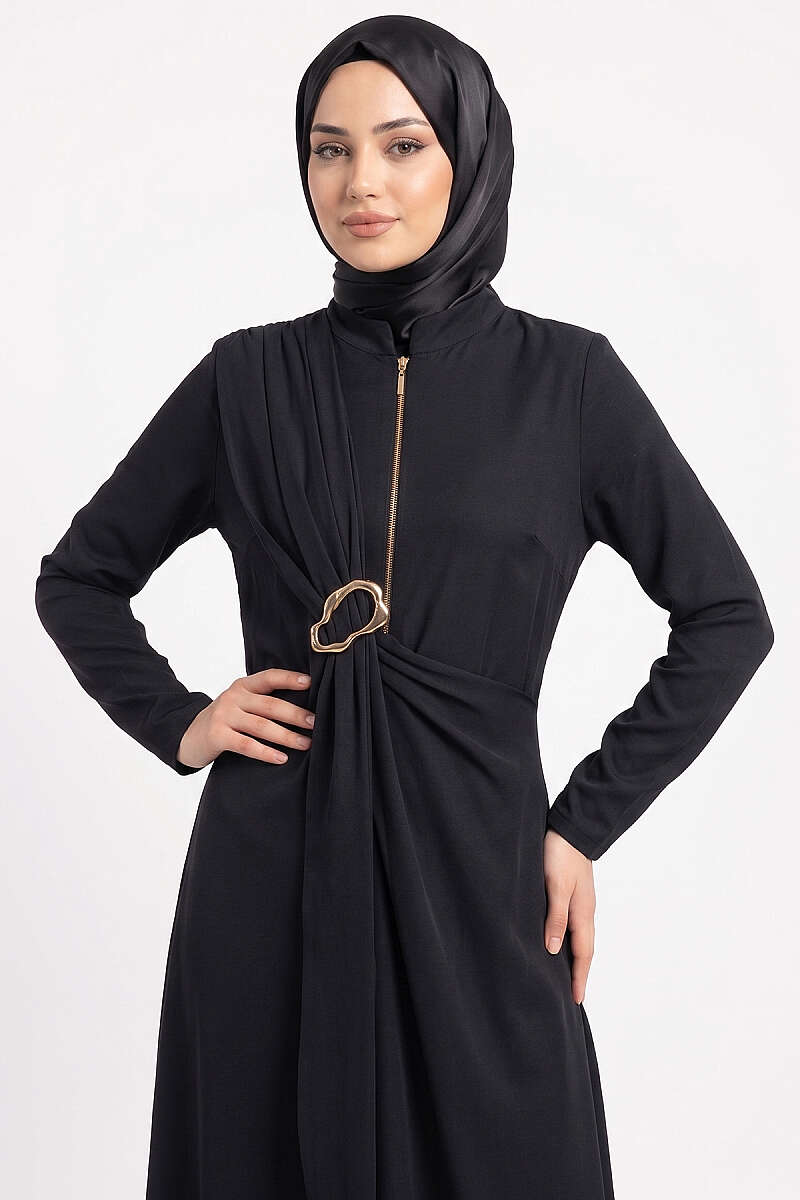 Yandan Bronşlu Büzgülü Elbise Siyah
