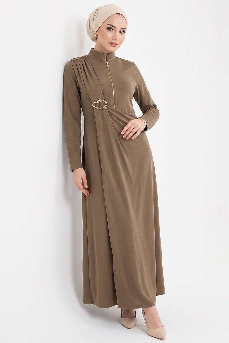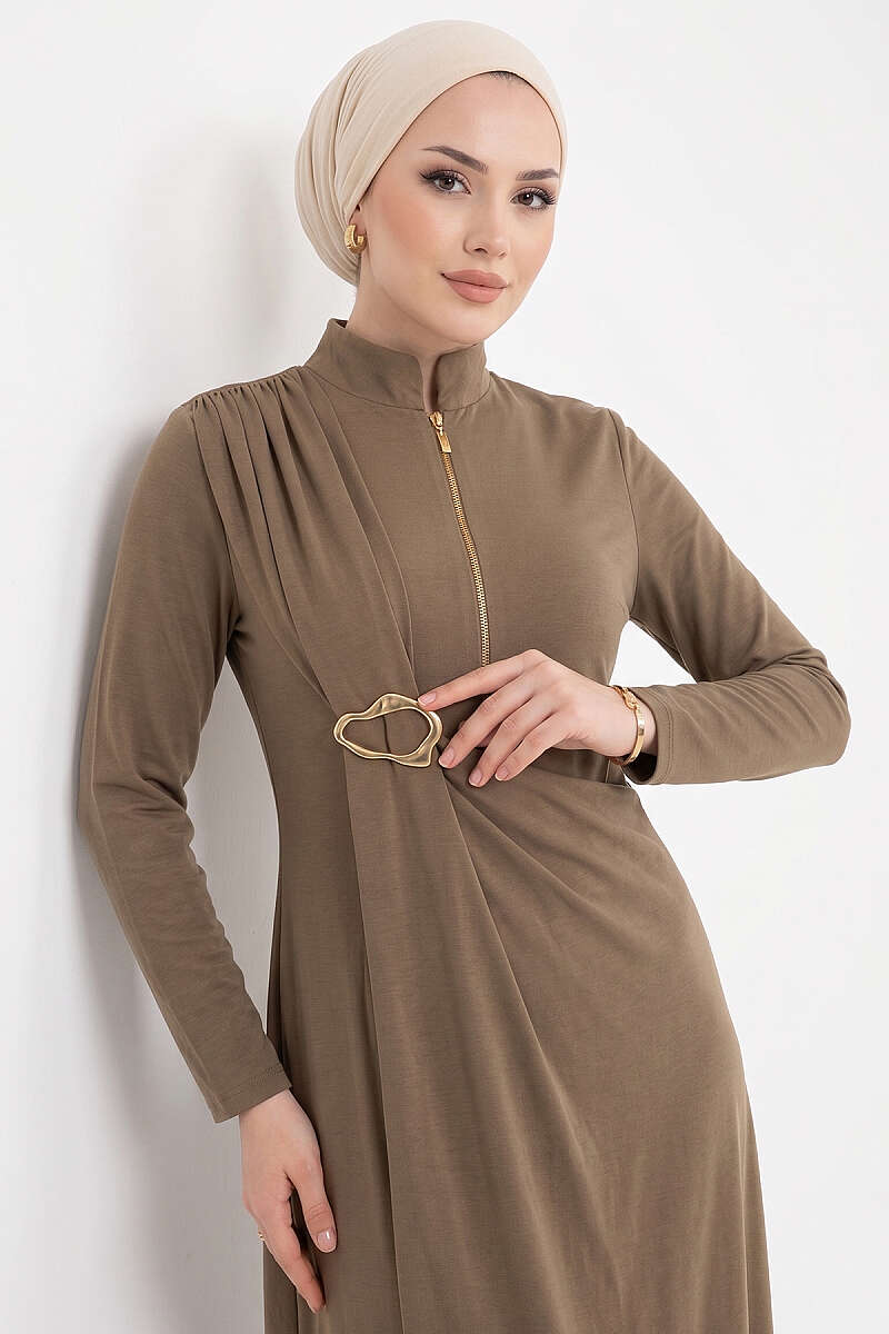 Yandan Bronşlu Büzgülü Elbise Kahve