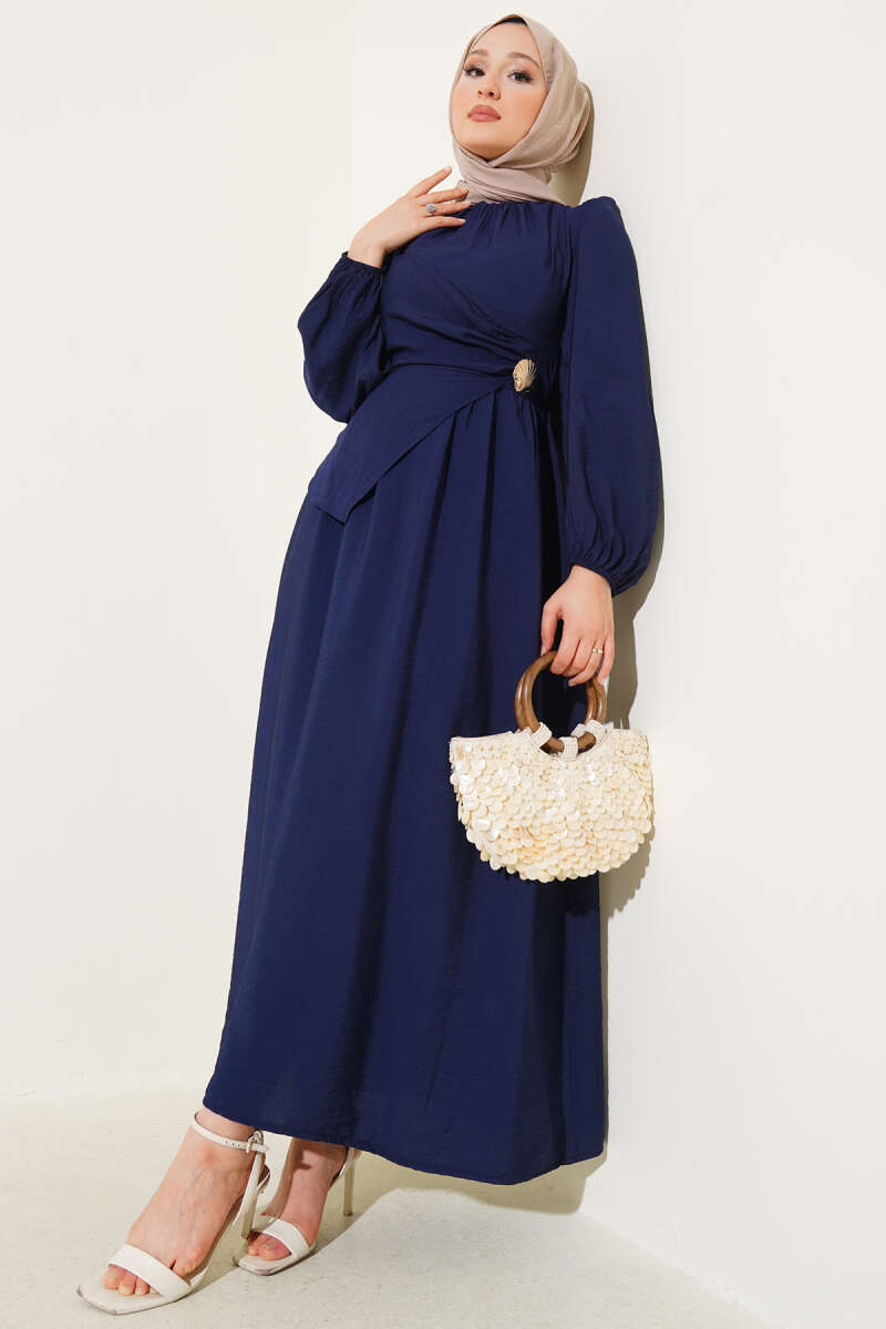 Omuz Pelerinli Taş Detaylı Abiye Elbise Lacivert
