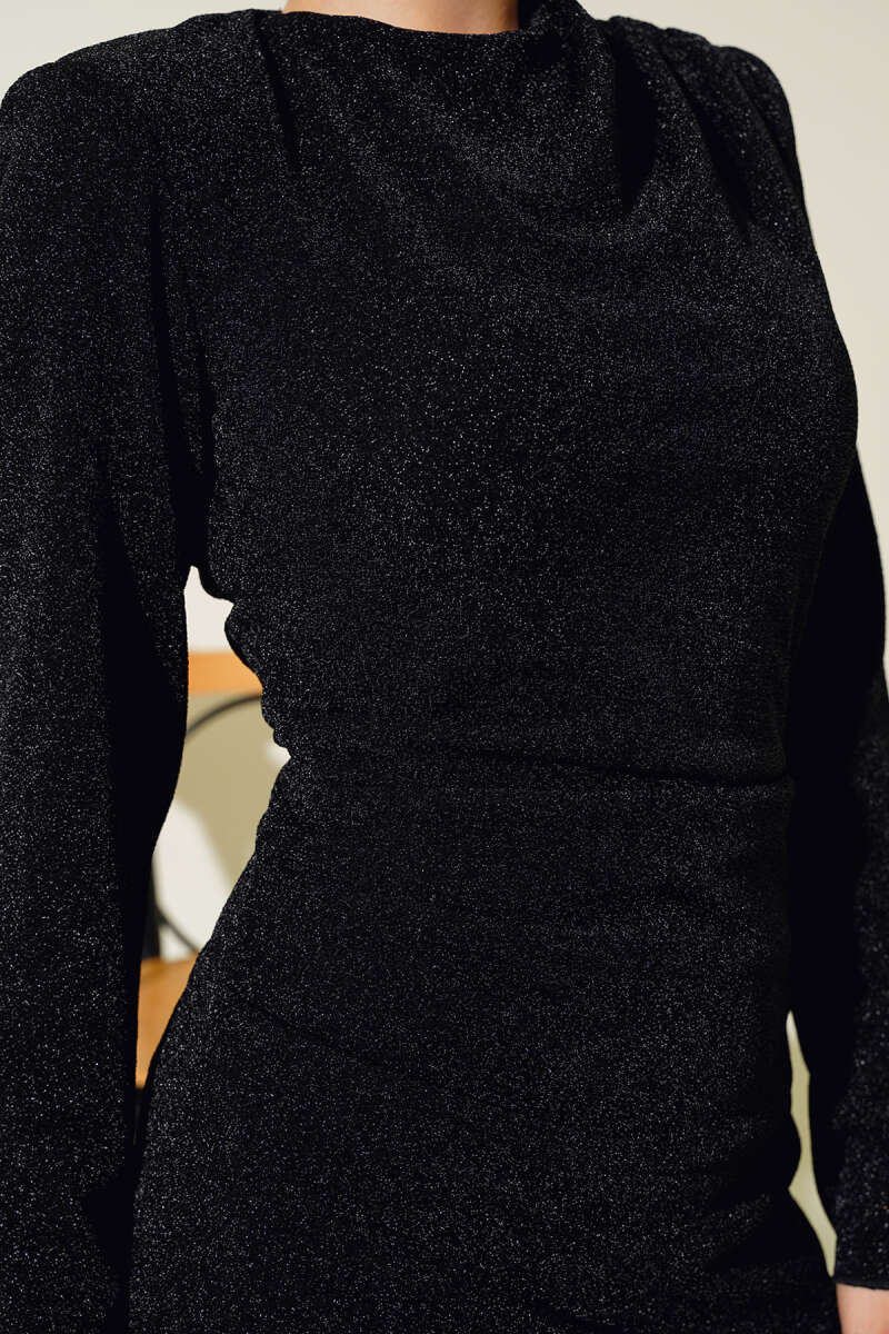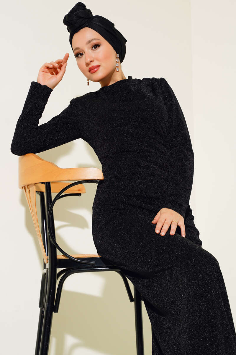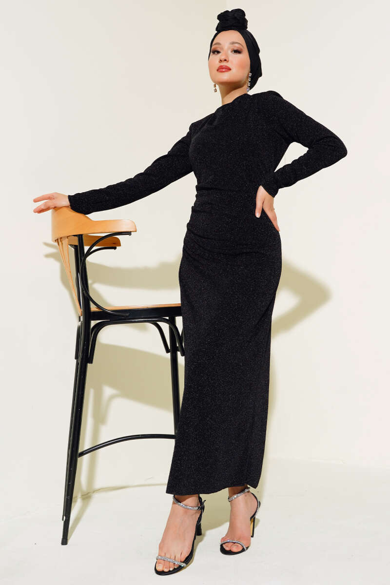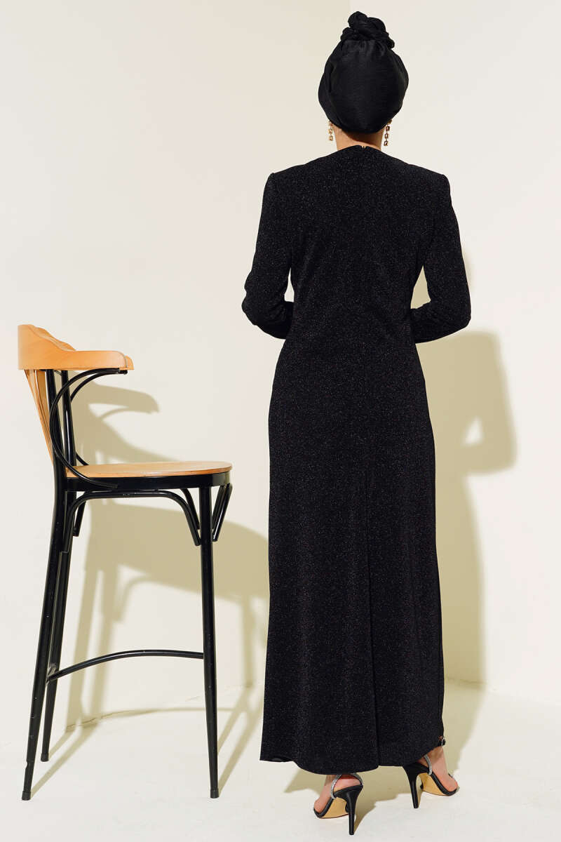 Bel Büzgü Detaylı Abiye Elbise Siyah