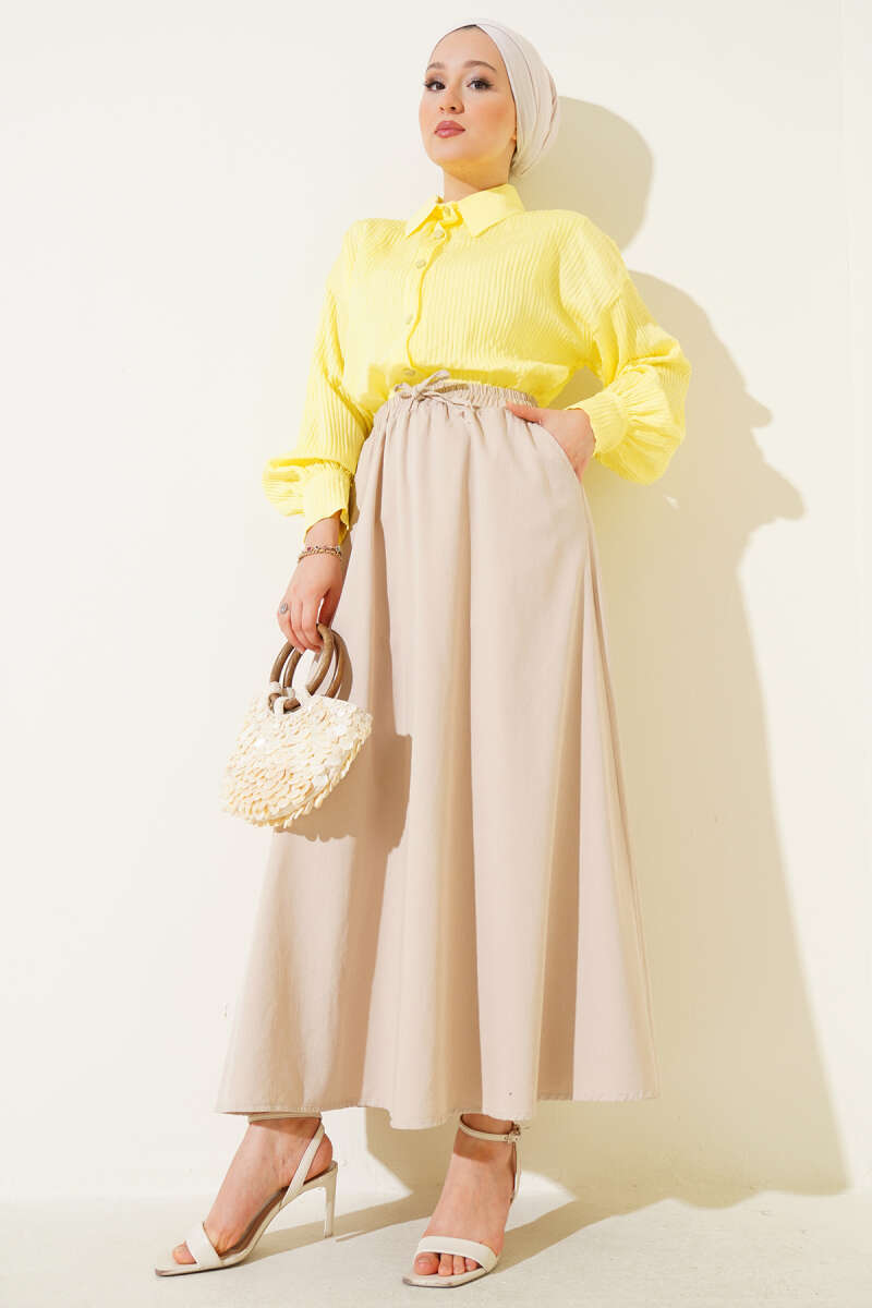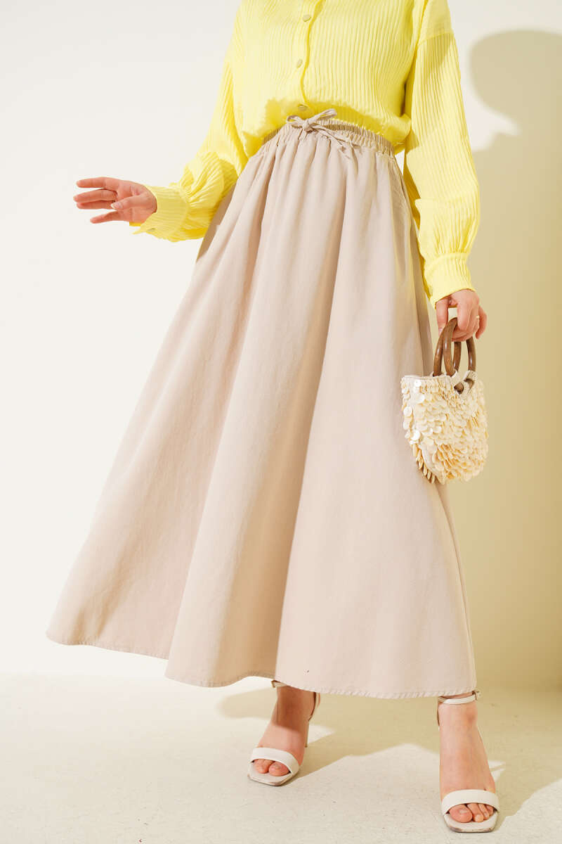 Beli Lastikli Ekose Desen Kloş Etek Bej