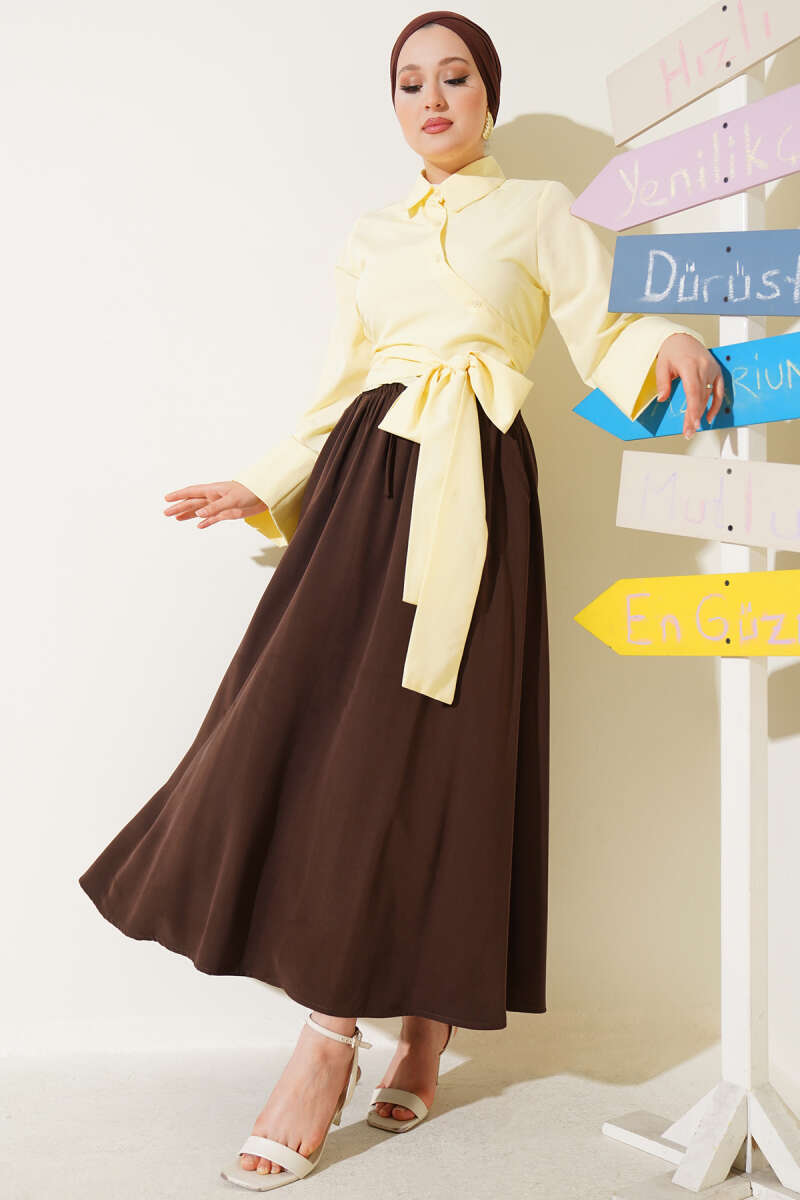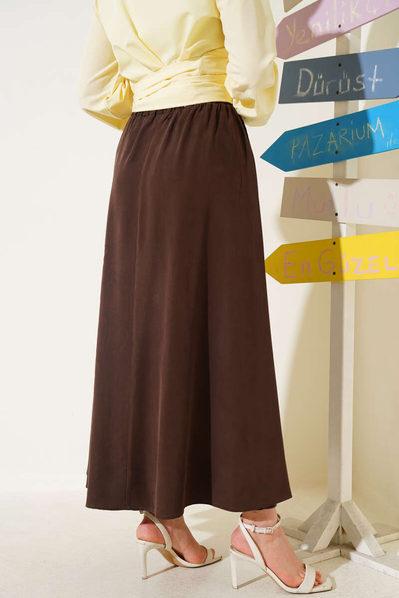 Beli Lastikli Ekose Desen Kloş Etek Kahve