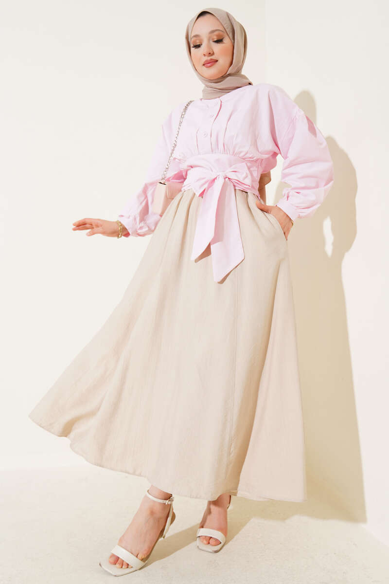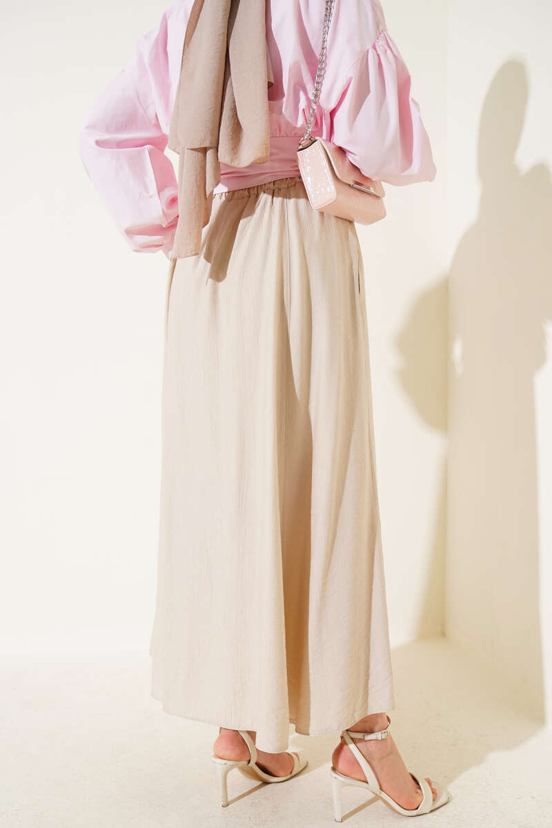 Beli Lastikli Ekose Desen Kloş Etek Bej