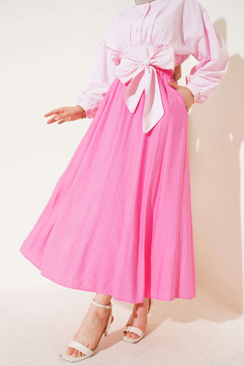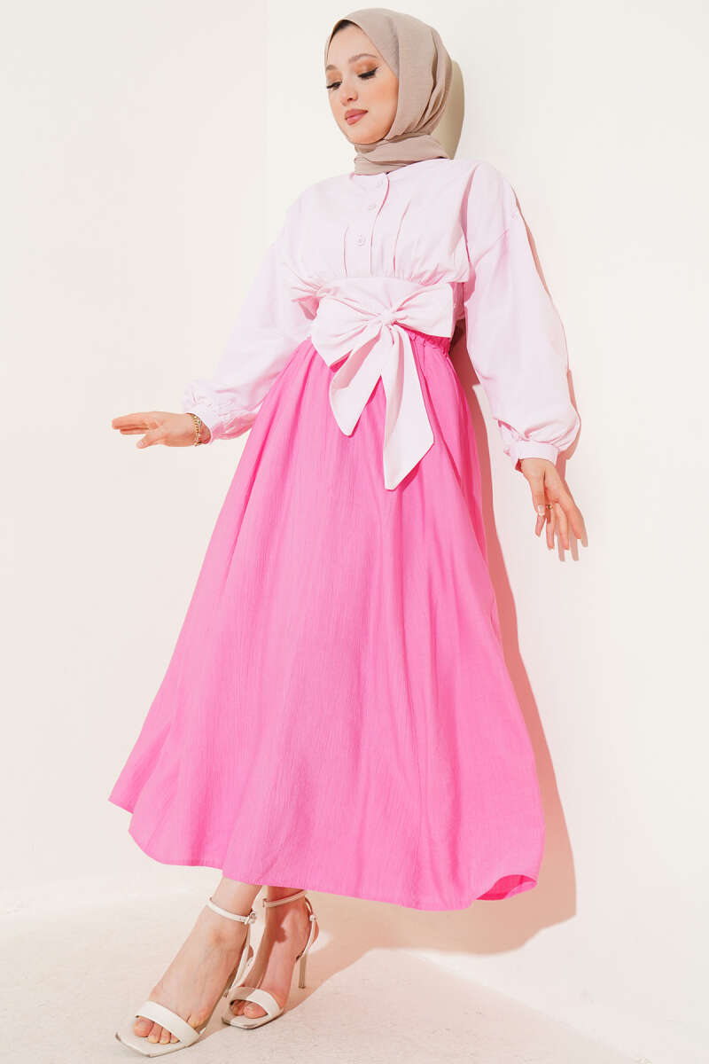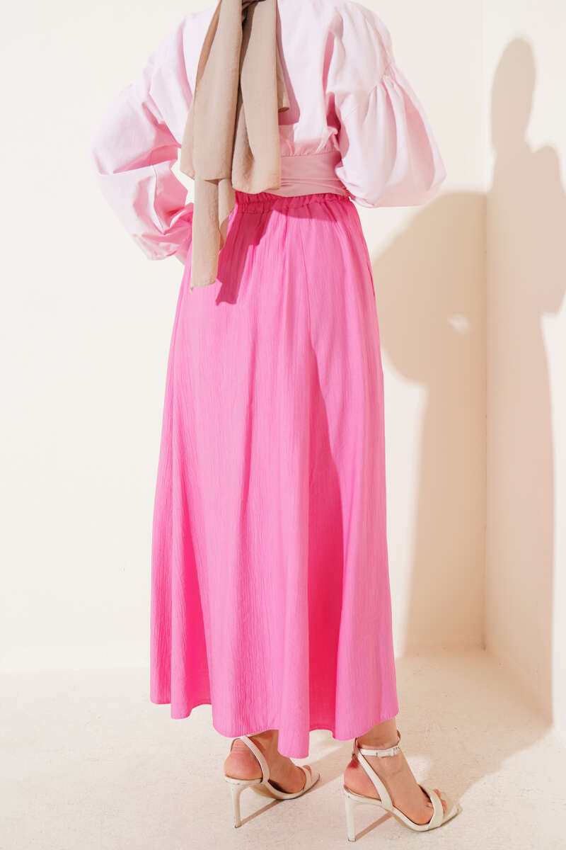 Bel Tünelli Düğmeli Ağaç Kabuğu Elbise Çağla Yeşili