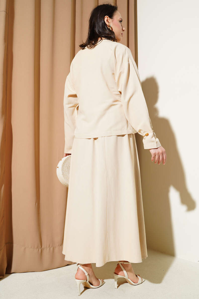 Yandan İp Bağlamalı Etekli Keten İkili Takım Bej