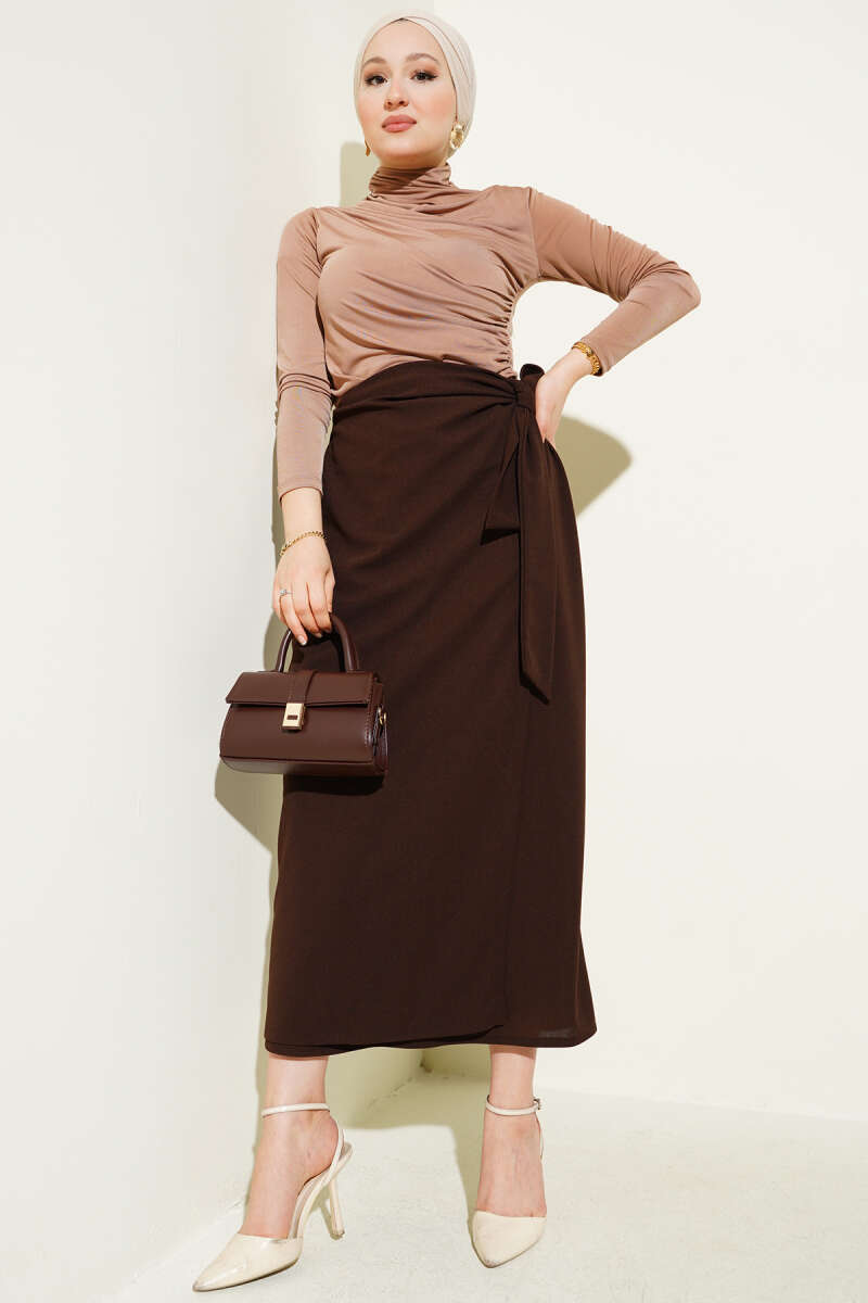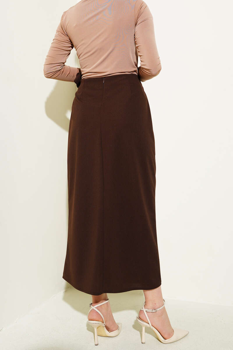 Beli Lastik Detaylı Kloş Scuba Etek Kahve