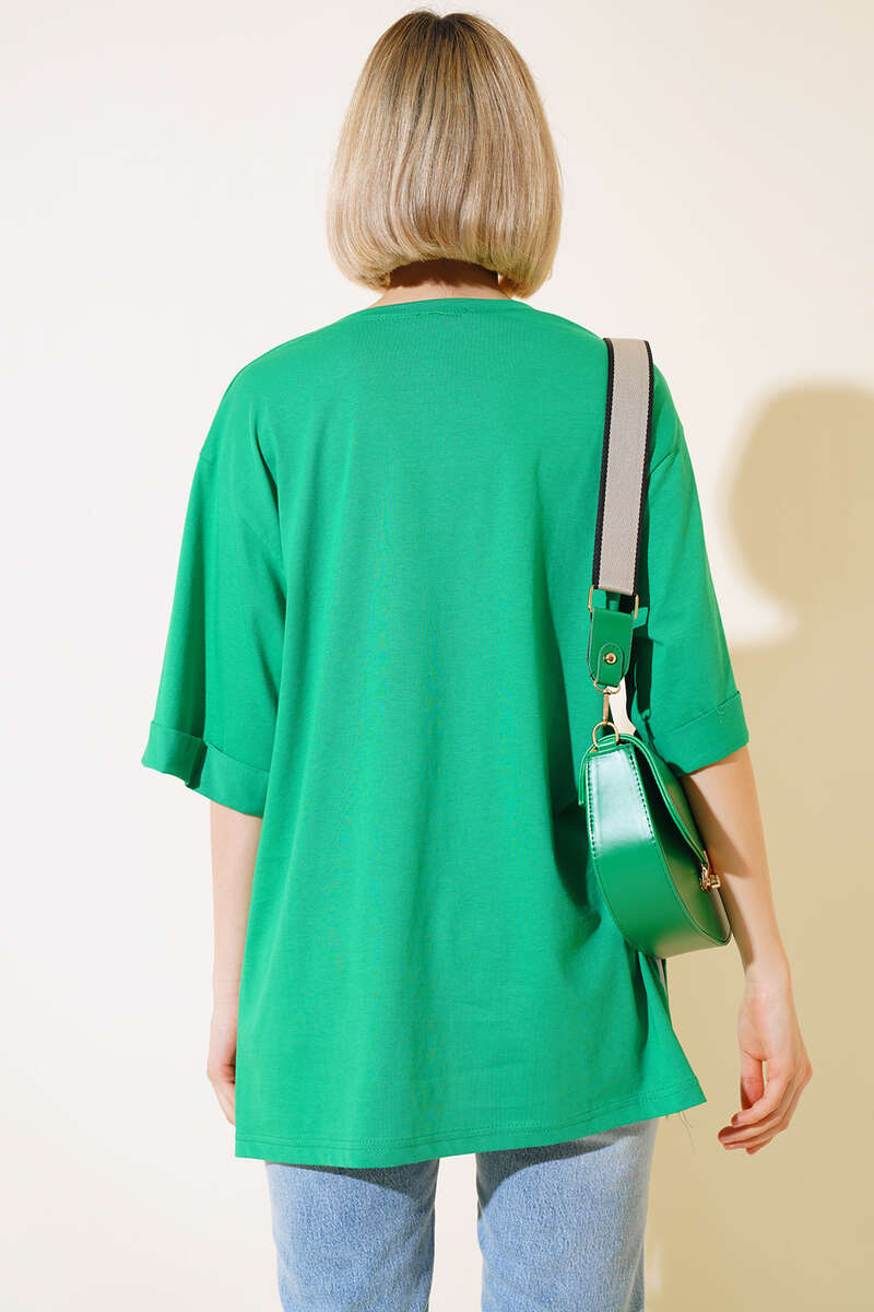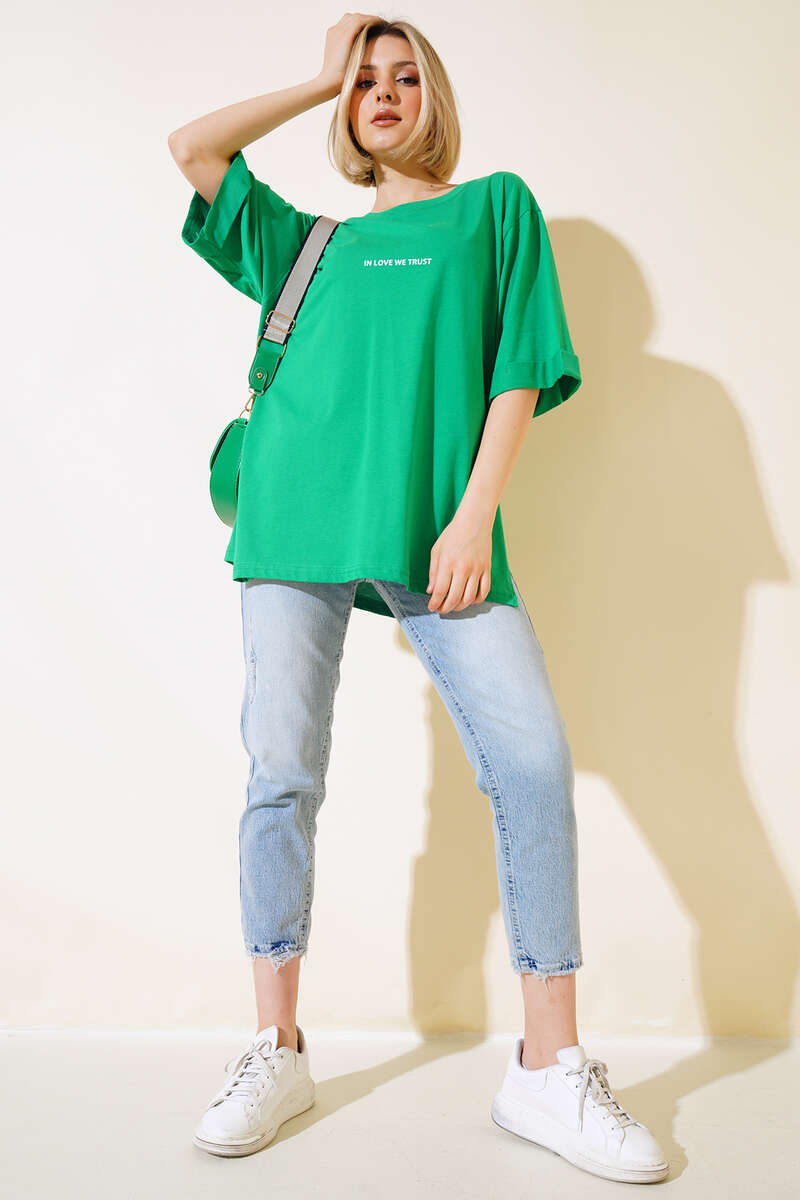 Yeni sezon t-shirt modelimiz tam sizlik. Önü yazı baskılıdır. Oversize modeldir. Salaş duruşuyla rahatlık sizinle olacak. Etek ucu yanlardan yırtmaçlıdır. T-shirt modelimizin renk seçenekleri mevcuttur.