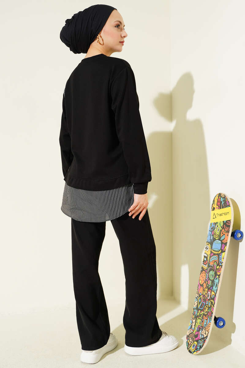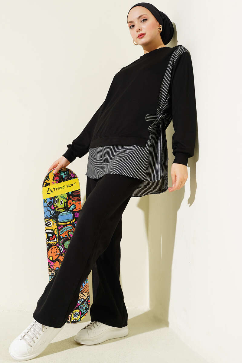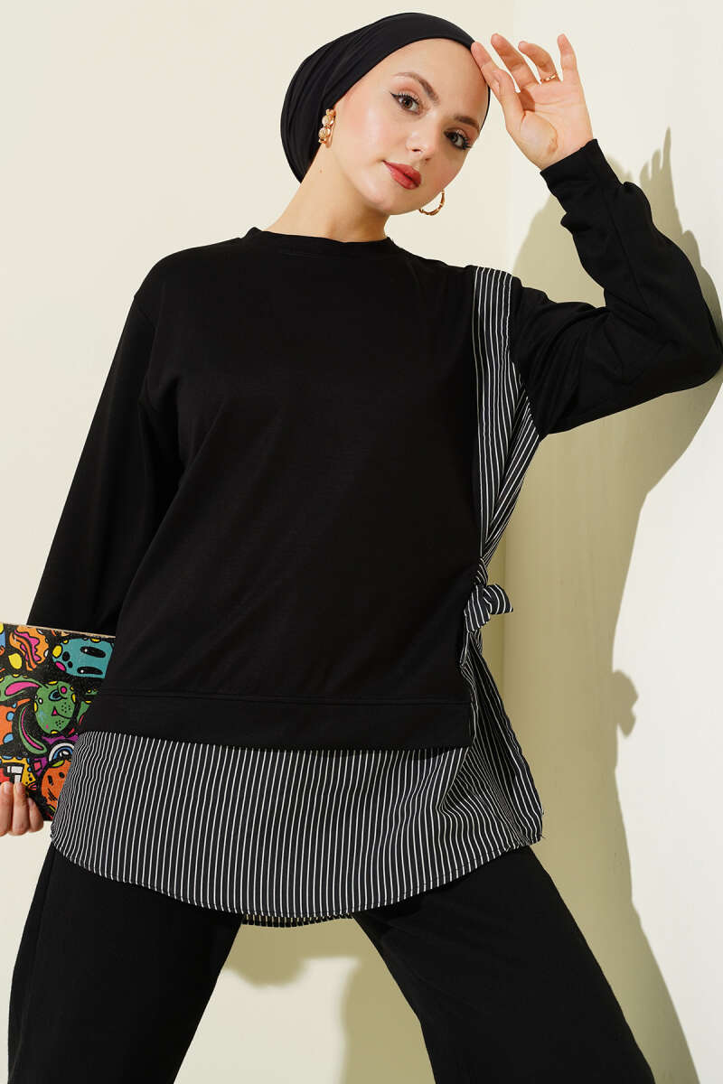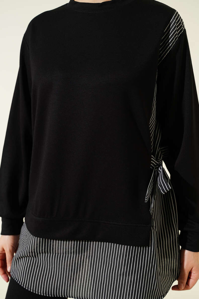 Yanı Bağlamalı Çizgi Detaylı Tunik Siyah