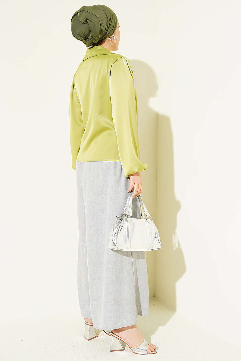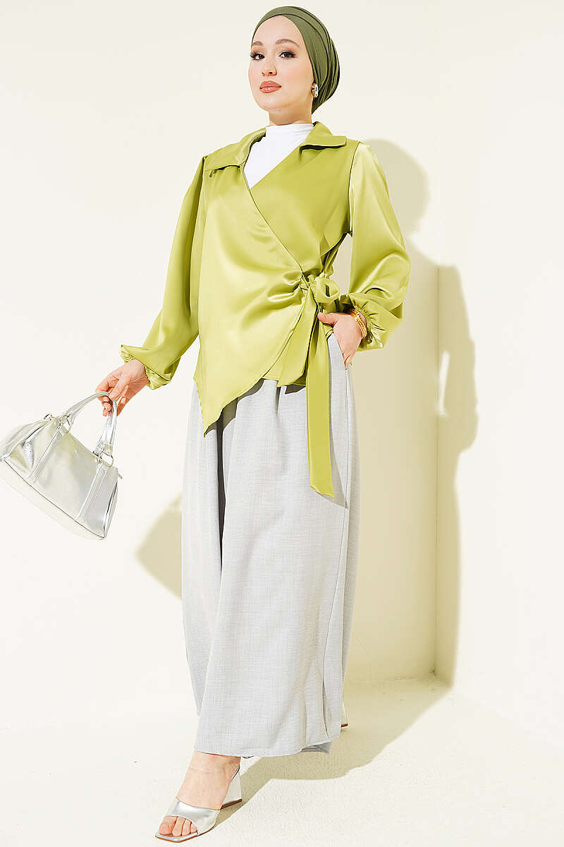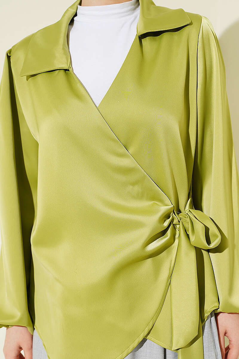 Yanı Bağlamalı Saten Bluz Fıstık Yeşili